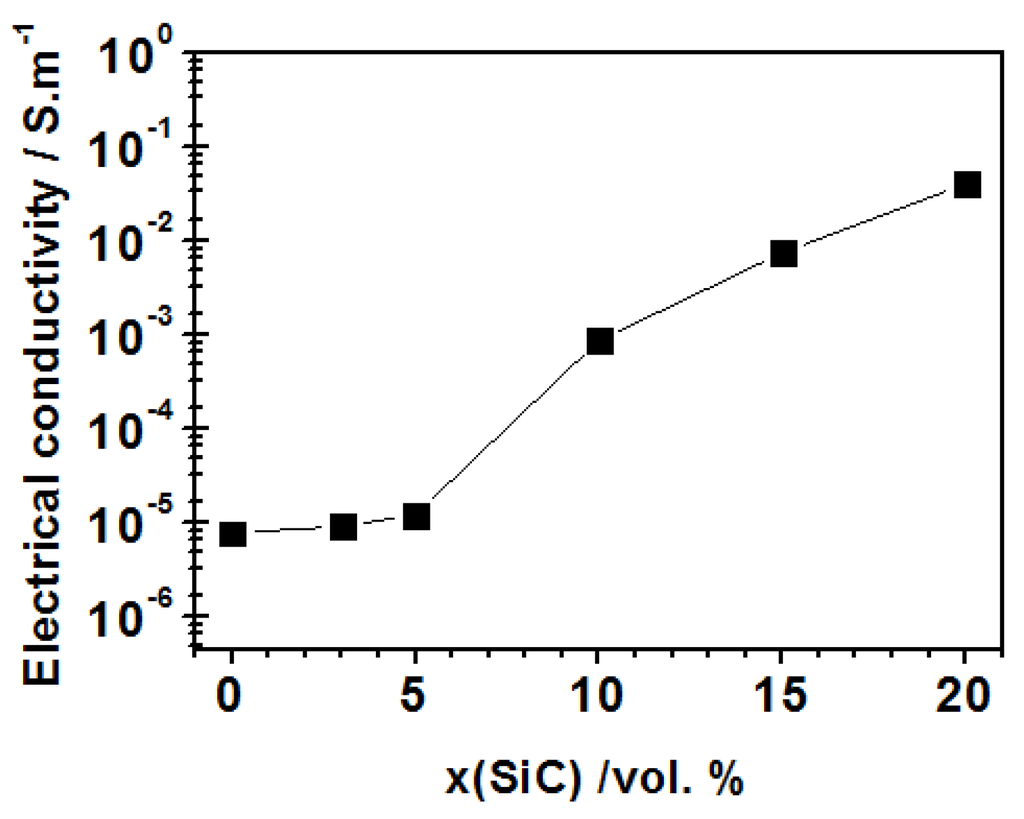 Unlike the moderate improvement of thermal conductivity, the electrical conductivity of alumina-based composites can be tailored in a much wider range [121]. The composites reinforced with conductive or semiconductive phases (such as silicon carbide), added in the amount at which they percolate the insulating alumina matrix, have received particular attention. Such electro-conductive or semiconductive ceramics are of special interest in a wide range of industrial applications. In the nanocomposites the electric properties are determined by many critical factors, such as the composition of powder mixtures (the volume fraction of SiC, content of silica as the product of surface oxidation of submicron SiC particles), content of other impurities, and the parameters of the final microstructure of the composite, including the size of alumina matrix grains and the size (micrometer or nanosized) and distribution (intergranular, intragranular or both) of SiC inclusions. The addition of SiC improves DC electrical conductivity, which increases with the volume fraction of SiC [126]. In the composite with 20 vol% of SiC, conductivity of 4.05 × 10−2 S·m−1 was measured, which represents an increase of four orders of magnitude in comparison to the monolithic alumina reference (7.80 × 10−6 S·m−1) (Figure 6). The electrical conductivity of the Al2O3-SiC nanocomposites with the same volume fraction but different size of SiC particles is comparable.