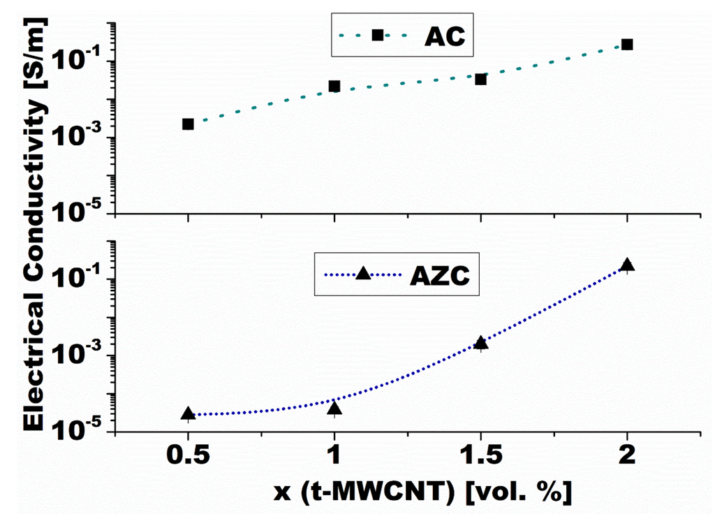 Composition dependence of DC electric conductivity of Al2O3-MWCNT (material AC) and Al2O3-ZrO2-MWCNT (material AZC) nanocomposites [95].