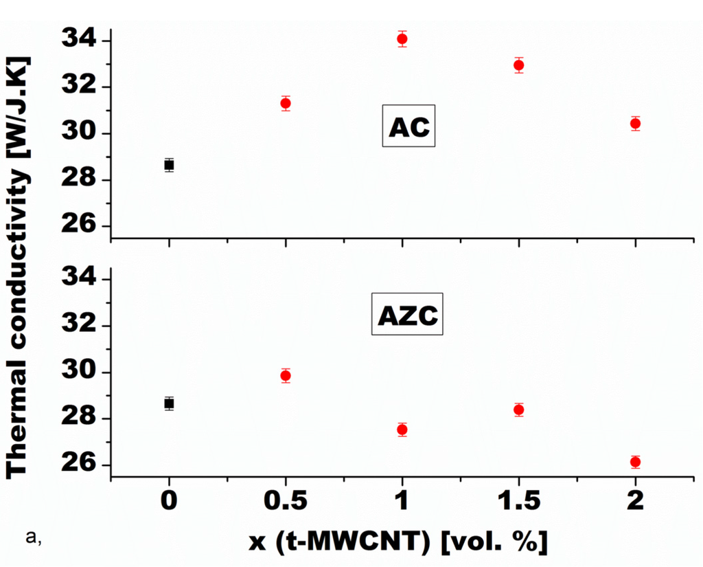 Composition dependence of thermal conductivity of Al2O3-MWCNT (material AC) and Al2O3-ZrO2-MWCNT (material AZC) nanocomposites [95].