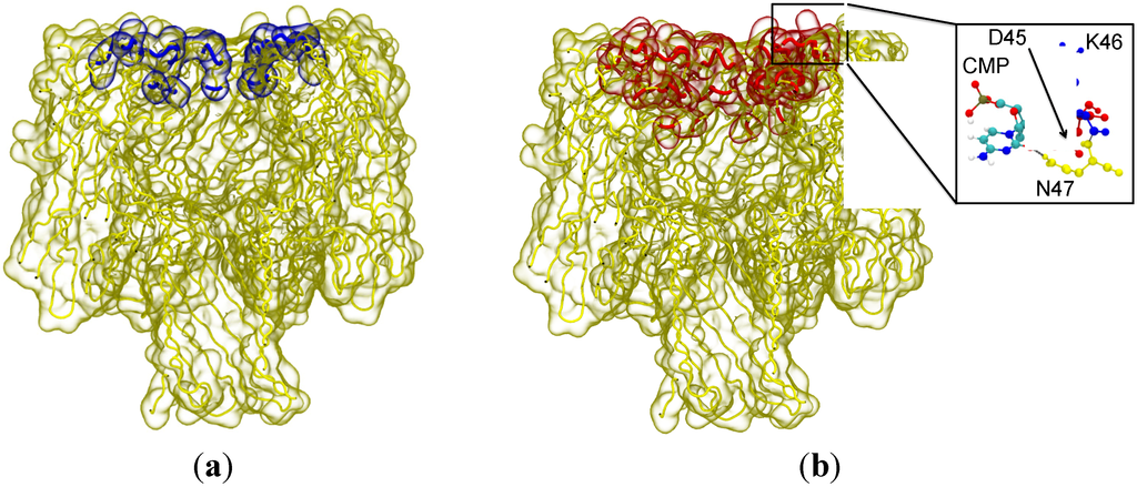 The residues with the highest propensity to interact with the nucleotide for: failed capture (a) and possible capture (b). The blue highlighted residues corresponding to failed capture are on the edge of the vestibule entrance and on the surface of the vestibule. The red highlighted residues associated with possible capture are predominantly on the edge of the entrance to the vestibule. (Inset) The most frequently observed binding mode between cytosine monophosphate (CMP) and the amino acid triplet, D45, K46 and N47. Hydrogen bonds (dashed lines) are observed between the hydroxyl group of the sugar and the side-chain of D45, as well as the nucleobase and the side-chain of N47. These hydrogen bonds are stable and are present for extended periods of time (greater than 1 ns). Residues are coloured for clarity; D45 in red K46 in blue, and N47 in yellow.