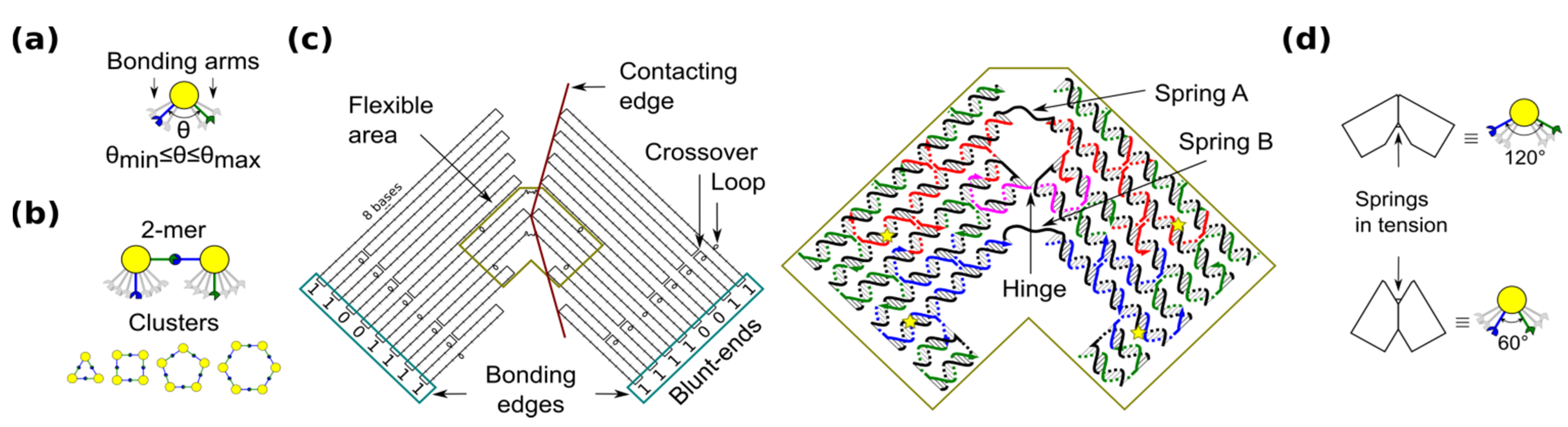 Shape-variable building block and design with DNA origami. (a) Abstract representation of the block with two bonding arms; (b) 2-mers in cis configuration and assembled polymorphic clusters (from 3-mers up to 6-mers); (c) (left): Origami scaffold (black), flexible area (mustard), contacting edges (red) and blunt-ends with binary codes (sky-blue); (right): Detail of the flexible area showing staples in colour (yellow stars indicate scaffold loops for tuning springs); (d) Origami profile and its correspondent abstract representation for the 60° and 120° configurations.