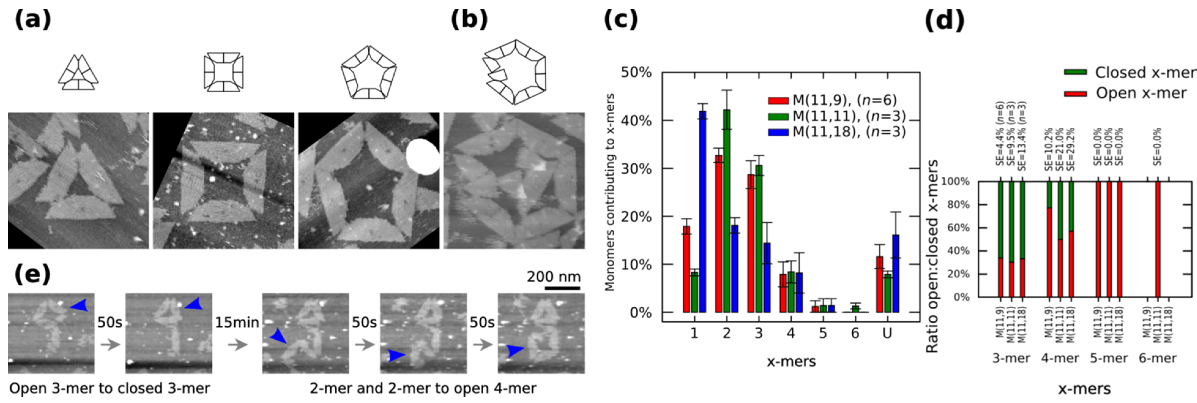 Polymorphic clusters made of shape-variable monomers before “reconfiguration protocol” (a–d) and during the “reconfiguration protocol” (e). (a–b) Clusters of M (11,11). First row: cluster representations. Second row: AFM images. 3-mers, 4-mers and 5-mers (a) and open 6-mers (b) at 2 nM concentration. (c–d) Distribution of monomers contributing to the formation of x-mers in open and closed states (c) and ratio open:closed x-mers (d) for M (11,9), M (11,11) and M (11,18). U indicates unclear monomers. (e) Inset of the frames in movie in Supplementary Information (0.02 fps). A 3-mers closes and two 2-mers self-assemble into an open 4-mer. AFM images in (a) are 310 nm × 300 nm in size. Error bars in (c) and SE in (d) indicate the standard error. n indicates the number of analysed AFM images of 2040 nm × 1680 nm, and the number of counted monomers per each AFM image is shown in Figure S12.