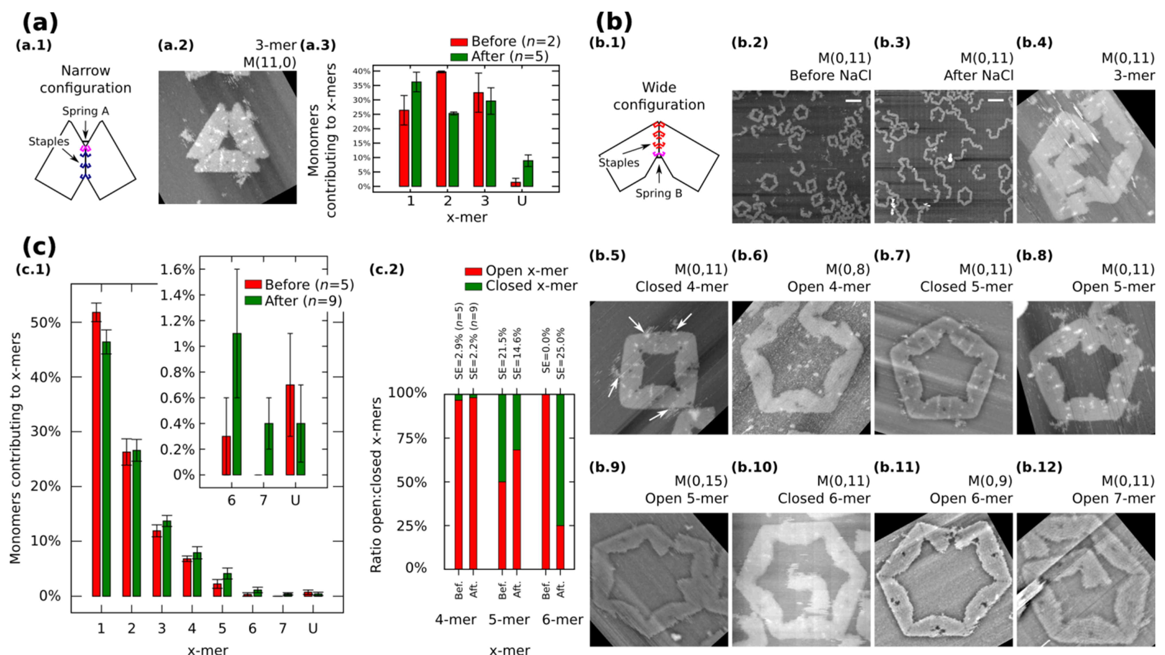 AFM images of M (0,11) prepared in solution show the formation of polymorphic clusters (Figure 3b.2). 4-mers (28 open and one closed) and 5-mers (four open and four closed) are found in open and closed states among five AFM images of 2040 nm × 1680 nm (number of monomers per image are indicated in Figure S12). However, only one open 6-mers is observed (among 179 monomers in one AFM image), indicating kinetic traps in the formation process of 6-mers. These traps are possibly due to the flexibility of the origami, in other words, the stacking interaction compensates the energy required to bend the DNA helices favoring narrow angles for the monomer.