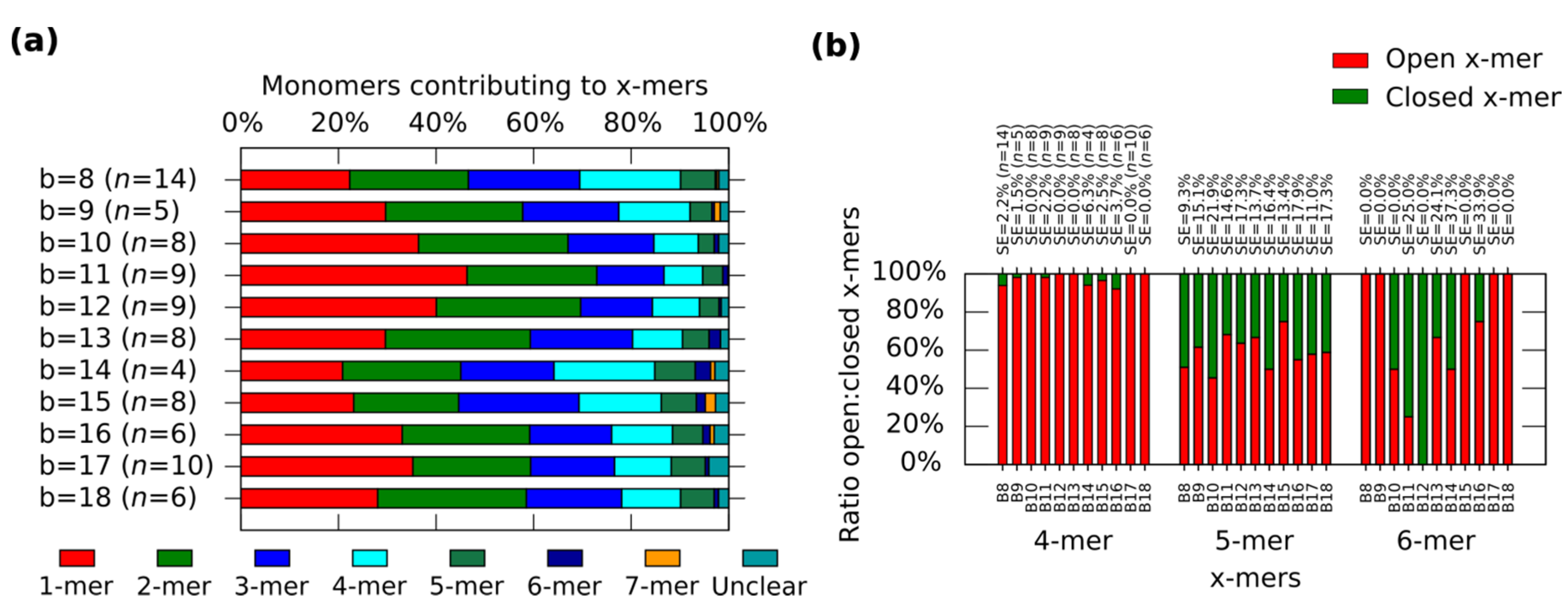 Distributions of the clusters after reconfiguration for M (0,b) (b = 8−18). (a) Distribution of monomers contributing to the formation of x-mers including open and closed states. Colours indicate each type of cluster. Yellow indicates open 7-mer. Analysed AFM areas are 2240 nm × 1680 nm; (b) Ratio open:closed clusters for 4-mers, 5-mers and 6-mers. Error bars in (a) and SE in (b) indicate the standard error. n indicates the number of analysed AFM images of 2040 nm × 1680 nm, and the number of counted monomers per each AFM image is shown in Figure S12.