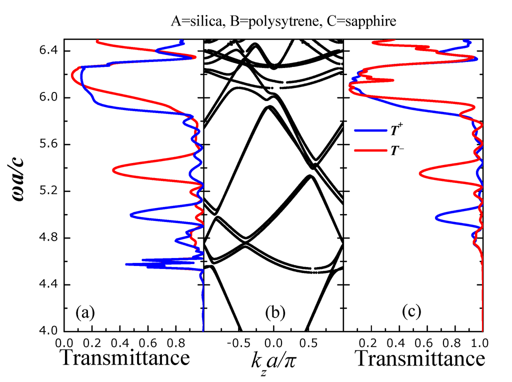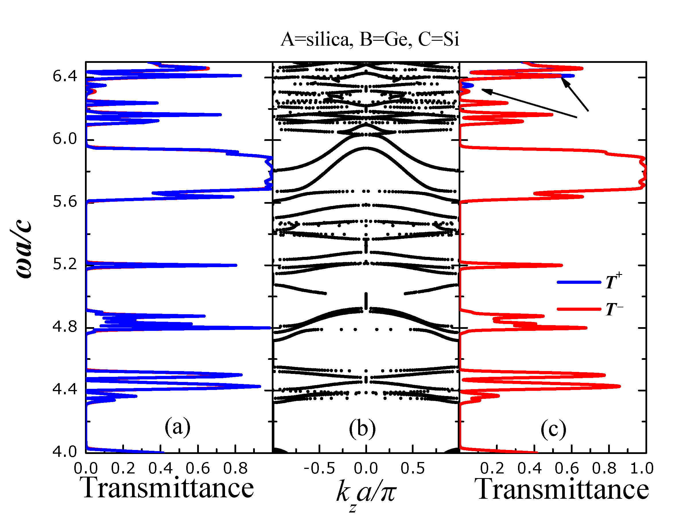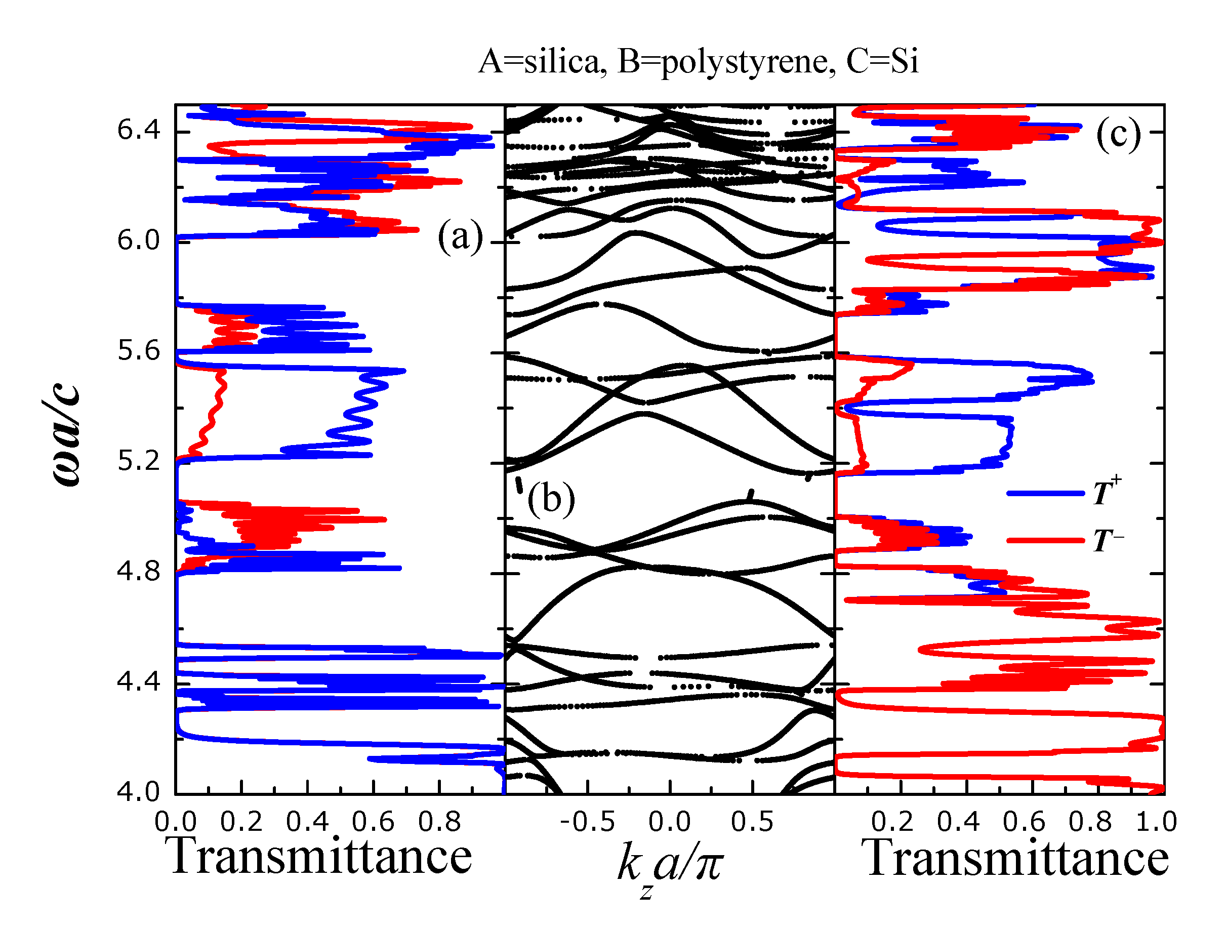Next, we consider a PC heterostructure with the (same) unit cell of Figure 1 but with the polystyrene spheres (the B-type spheres in Figure 3) substituted with germanium (ϵ = 16.2) ones. Evidently, both spectra of T+ and T− practically coincide apart from two very narrow regions denoted by the arrows in Figure 4c. This is in accordance with the corresponding frequency band structure of Figure 4b where all frequency bands are symmetric with respect to the center kz = 0. Obviously, the inclusion of materials of high-index contrast in the considered photonic-crystal heterostructures does not favor the emergence of unidirectional propagation.