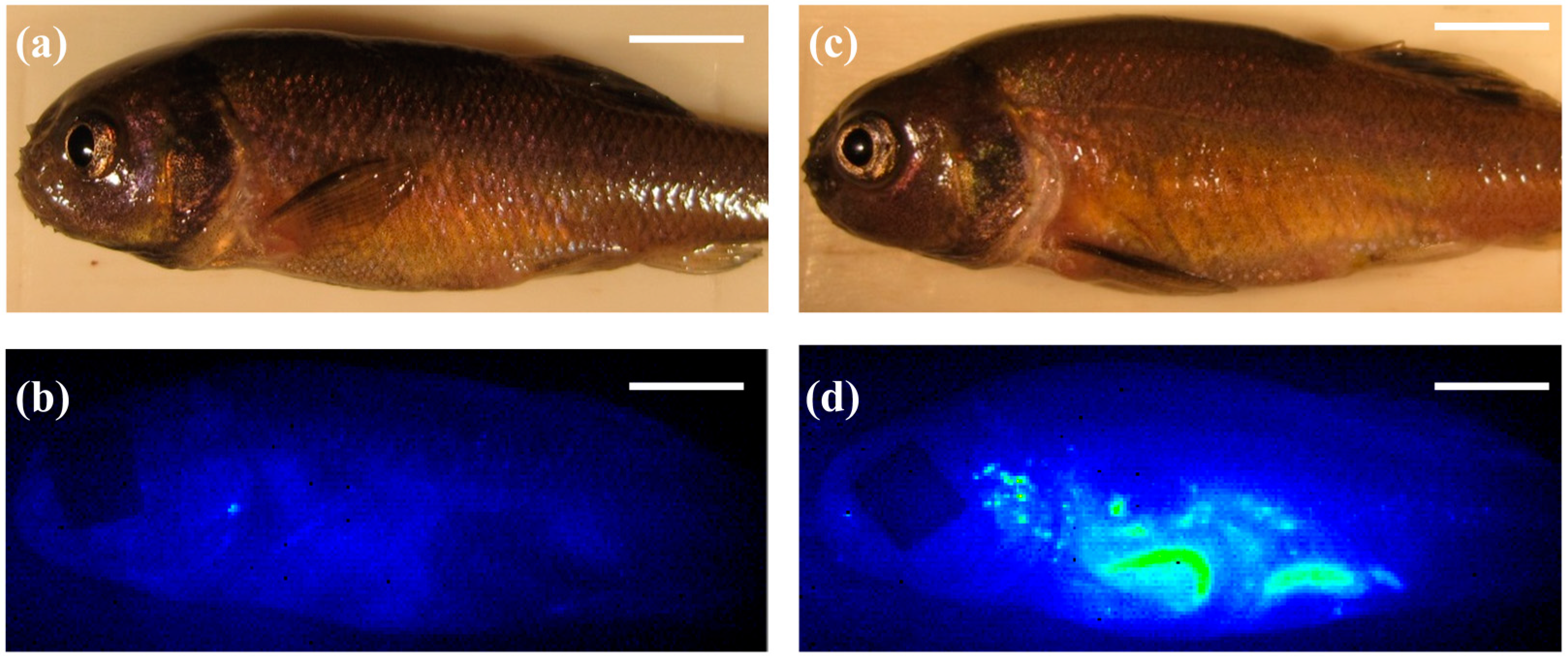 Near-infrared fluorescence (NIRF) imaging of fathead minnows (FHMs) fed single-walled carbon nanotubes (SWCNT) containing feed. Images of FHM fed a diet containing SWCNTs were collected throughout the study. The solid white line is a scale bar representing 5 mm. (a) Representative light image of control FHM; (b) Corresponding NIRF image of control FHM; (c) Representative light image of FHM exposed to SWCNT diet; (d) Corresponding NIRF image of FHM fed a SWCNT diet for 12 h. SWCNTs can be observed in live fish as indicated by increased fluorescence intensity of the pseudocolor.