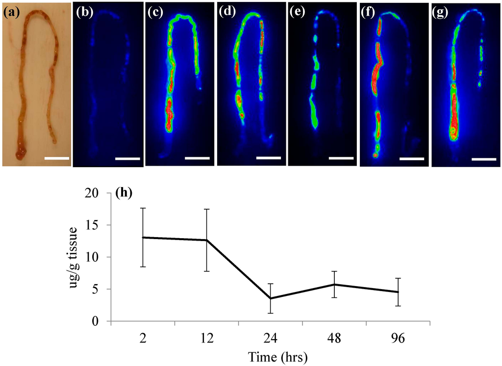 In the current study, fathead minnows (FHMs), Pimephales promelas, were exposed to SWCNT-containing diets for 96 h and NIRF was used to examine uptake of these materials. Exposure to these diets did not cause mortality or any observable morbidity in FHMs throughout the 96 h exposure period. This is similar to previous studies examining oral exposure of fish to SWCNTs that also found no overt toxicity [4,5]. Mixture of SWCNTs in the fish diet did not quench their fluorescence and within 2 h of the initial SWCNT feeding, fluorescence from the SWCNTs was observed in whole live fish using NIRF imaging (Figure 1d). The control diet also did not produce appreciable background fluorescence that would decrease the sensitivity of the NIRF imaging system (Figure 1b). Though SWCNT fluorescence could be observed in live fish throughout the exposure, individual organs were excised at time points for qualitative imaging and quantitative measurements of SWCNTs in FHM tissues. Both intestines and livers were removed from fish and imaged separately. NIRF imaging of FHM intestines indicated distribution of SWCNTs throughout the intestine for the entire duration of the exposure (Figure 2). Further quantification of SWCNTs in intestinal tissue using NIRF spectroscopy confirmed that feeding of a SWCNT diet remained fairly consistent throughout the exposure period (Figure 2h).
