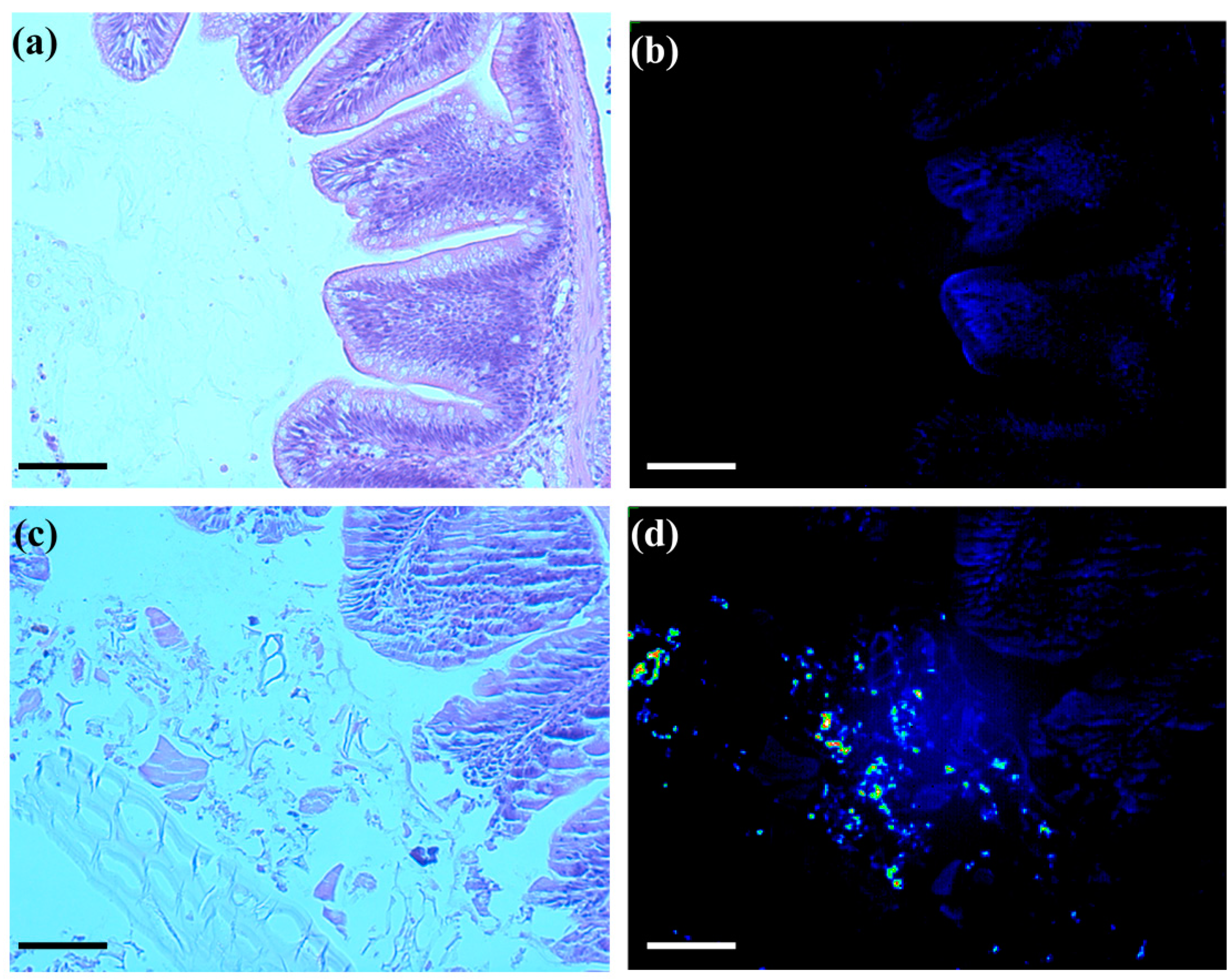 NIRF imaging of histological sections of FHM intestines. Histological sections of FHM intestines were examined to determine the localization of SWCNTs using NIRF. The solid lines is a scale bar representing 150 µm. (a) Representative light image of control FHM H&E stained intestinal cross section; (b) Corresponding NIRF image of control FHM intestinal cross section; (c) Representative light image of an intestinal cross section of FHM fed SWCNT diet; (d) Corresponding NIRF image of SWCNT fed intestinal cross section. SWCNT NIRF can be seen as increased fluorescence intensity of the pseudocolor. SWCNTs were only observed in the intestinal lumen with no evidence of association with or crossing the epithelia.