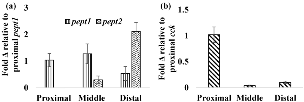 Relative expression of pept1, pept2, and cck in fish intestines. Expression of mRNA for pept1, pept2, and cck was measured in the proximal, middle, and distal intestines of normally fed FHMs to determine relative expression of these genes. (a) Relative mRNA expression of pept1 and pept2 throughout the FHM intestine. Expression is represented as the average ± standard error fold change from proximal pept1 expression; (b) Relative mRNA expression of cck throughout the FHM intestine. Expression is represented as the mean ± standard error fold change from proximal cck expression.
