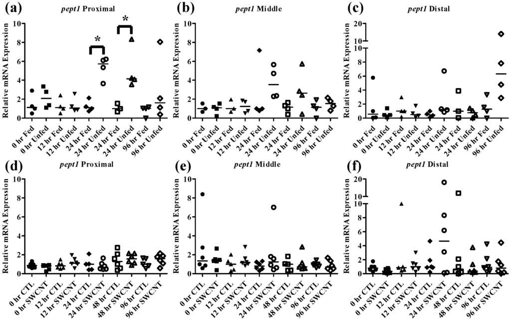 Intestinal pept1 mRNA expression of fed, vs. unfed and control vs. SWCNT fed FHMs. Expression of pept1 mRNA expression was measured in three intestinal sections of FHMs under different experimental conditions. Expression of individual replicate fish is presented relative to the corresponding control at that time point. Solid lines for each time point and treatment represents the median value. Statistical comparisons were made between treatments for each time point within each intestinal section and statistically significant values marked by an asterisk (p < 0.05). (a–c) Relative pept1 mRNA expression in fed and unfed FHM proximal, middle, and distal intestines, respectively; (d–f) Relative pept1 mRNA expression in proximal, middle, and distal intestines, respectively, of FHMs fed either control or SWCNT diets.