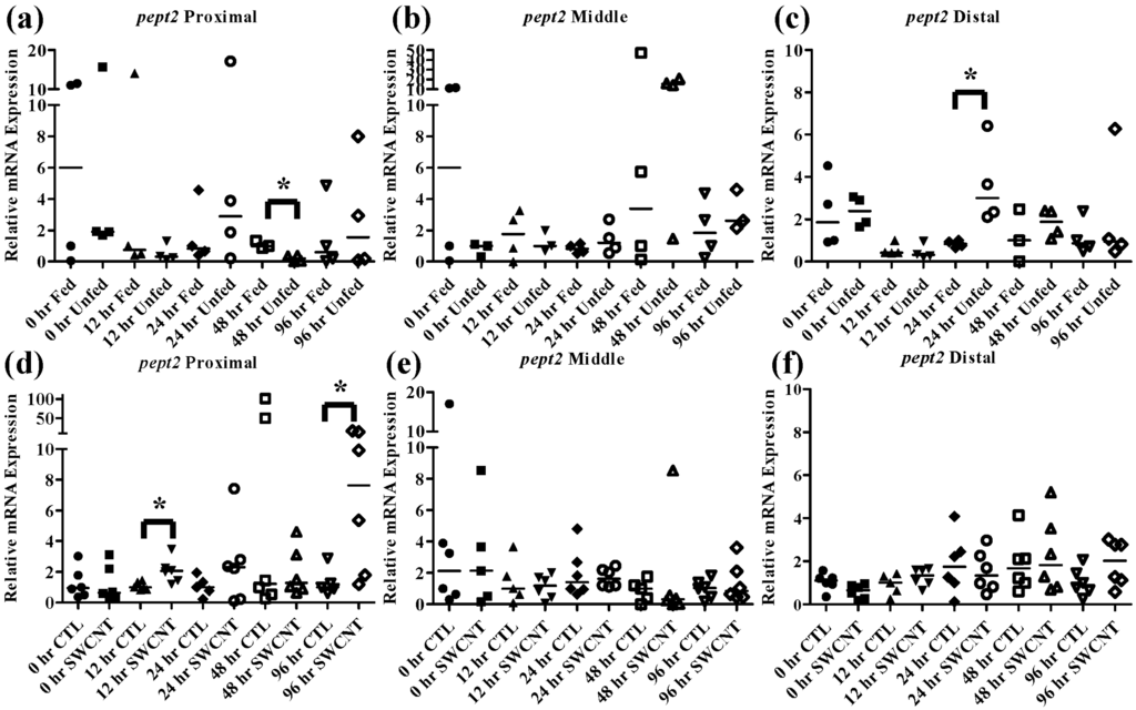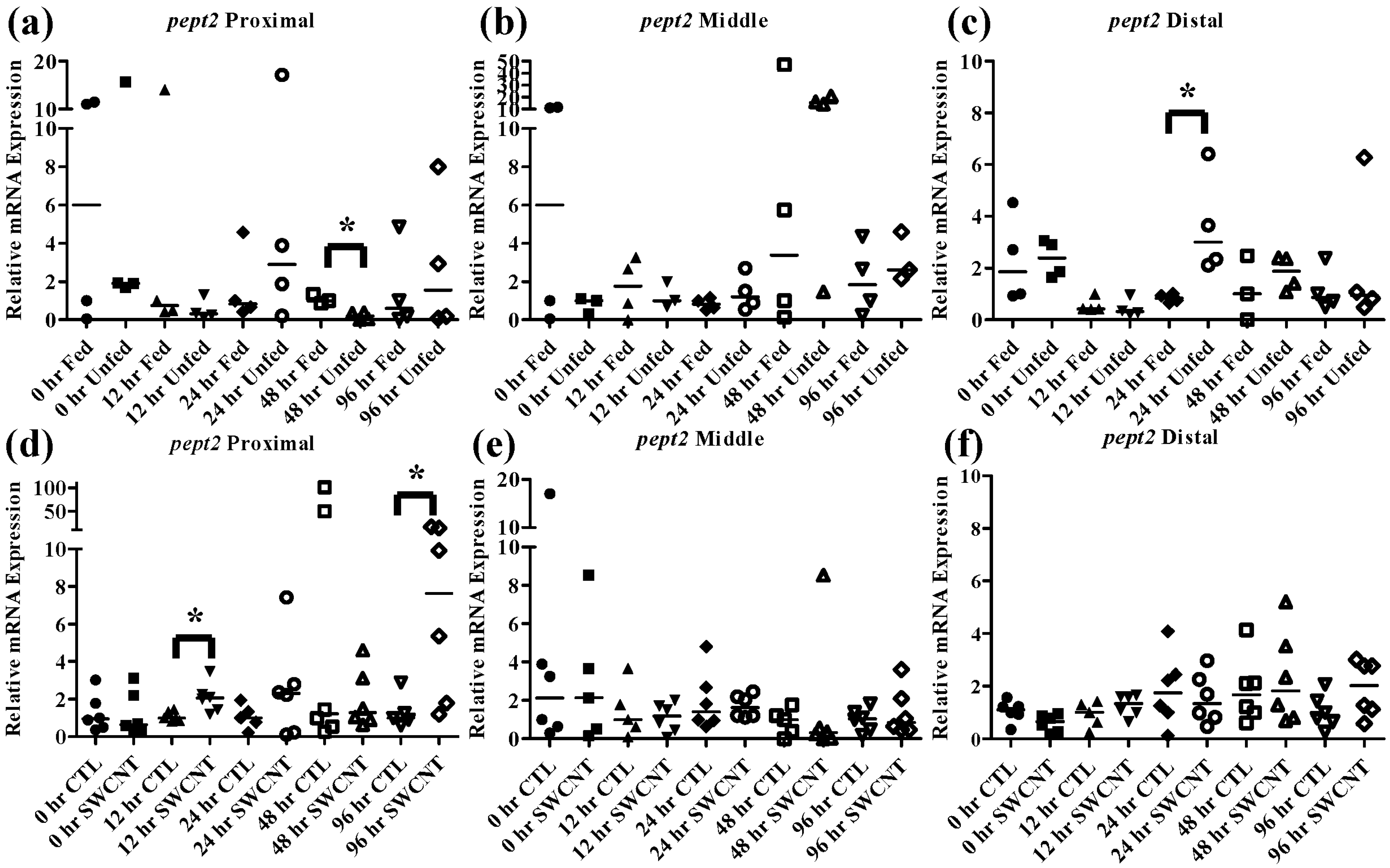 Intestinal pept2 mRNA expression of fed, vs. unfed and control vs. SWCNT fed FHMs. Expression of pept2 mRNA expression was measured in three intestinal sections of FHMs under different experimental conditions. Expression of individual replicate fish is presented relative to the corresponding control at that time point. Solid lines for each time point and treatment represents the median value. Statistical comparisons were made between treatments for each time point within each intestinal section and statistically significant values marked by an asterisk (p < 0.05). (a–c) Relative pept2 mRNA expression in fed and unfed FHM proximal, middle, and distal intestines, respectively; (d–f) Relative pept2 mRNA expression in proximal, middle, and distal intestines, respectively, of FHMs fed either control or SWCNT diets.