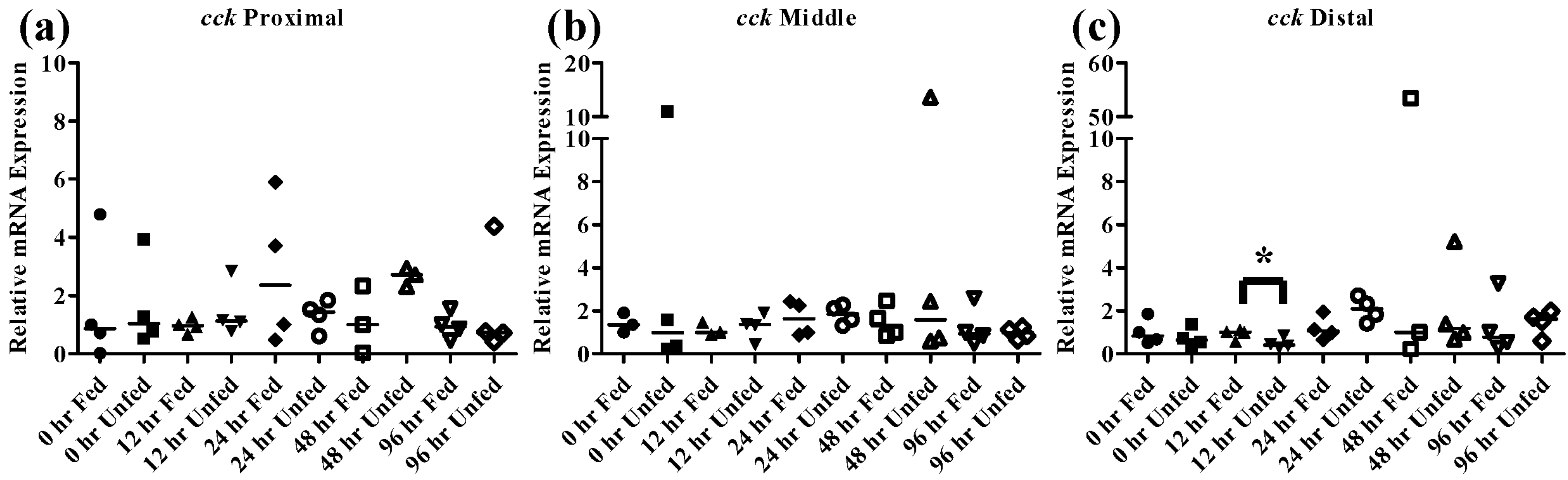 The peptide hormone cck is responsible for controlling the release of digestive enzymes into the intestines of fish as well as playing role in nervous system control of appetite [36]. While cck has been detected in many tissues in fish most studies have focused on its distribution in the intestine. Numerous fish species including bowfin, bluegill, dorado, and rainbow trout, exhibit similar patterns of cck distribution throughout the intestine with high levels in the proximal intestine, varying levels in the middle intestine and low levels in the distal intestine [37,38,39]. Similar results were found in the FHMs used in this study where high expression of cck in the proximal intestine and lower levels found in the middle and distal intestine (Figure 4b) were observed. During periods of nutrient depletion, cck responses also appear to be conserved across species with starvation conditions causing decreased expression in winter flounder, zebrafish, and white sea bream [20,22,36]. While there was no significant cck response in unfed FHMs proximal and middle intestines (Figure 7a,b), the distal intestine (Figure 7c) did exhibit decreased cck expression after 12 h suggesting a signal to increase feeding due to decreased nutrient availability. Expression of cck returned to control levels by 24 h which may indicate a switch to conservation of energy used on foraging during periods of low food availability.
