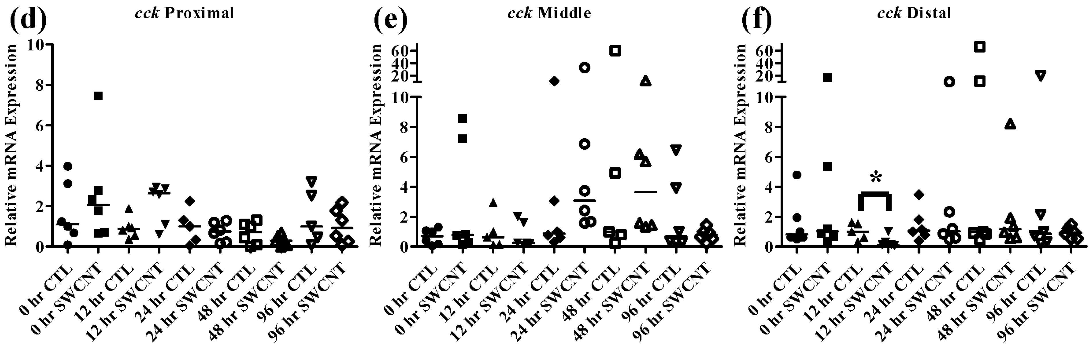 Intestinal cck mRNA expression of fed, vs. unfed and control vs. SWCNT fed FHMs. Expression of total cck mRNA expression was measured in three intestinal sections of FHMs under differing experimental conditions. Expression of individual replicate fish are presented as relative to the corresponding control at that time point. Solid lines for each time point and treatment represents the median value. Statistical comparisons were made between treatments for each time point within each intestinal section and statistically significant values marked by an asterisk (p < 0.05). (a–c) Relative cck mRNA expression in fed and unfed FHM proximal, middle, and distal intestines, respectively; (d–f) Relative cck mRNA expression in proximal, middle, and distal intestines, respectively, of FHMs fed either control or SWCNT diet.