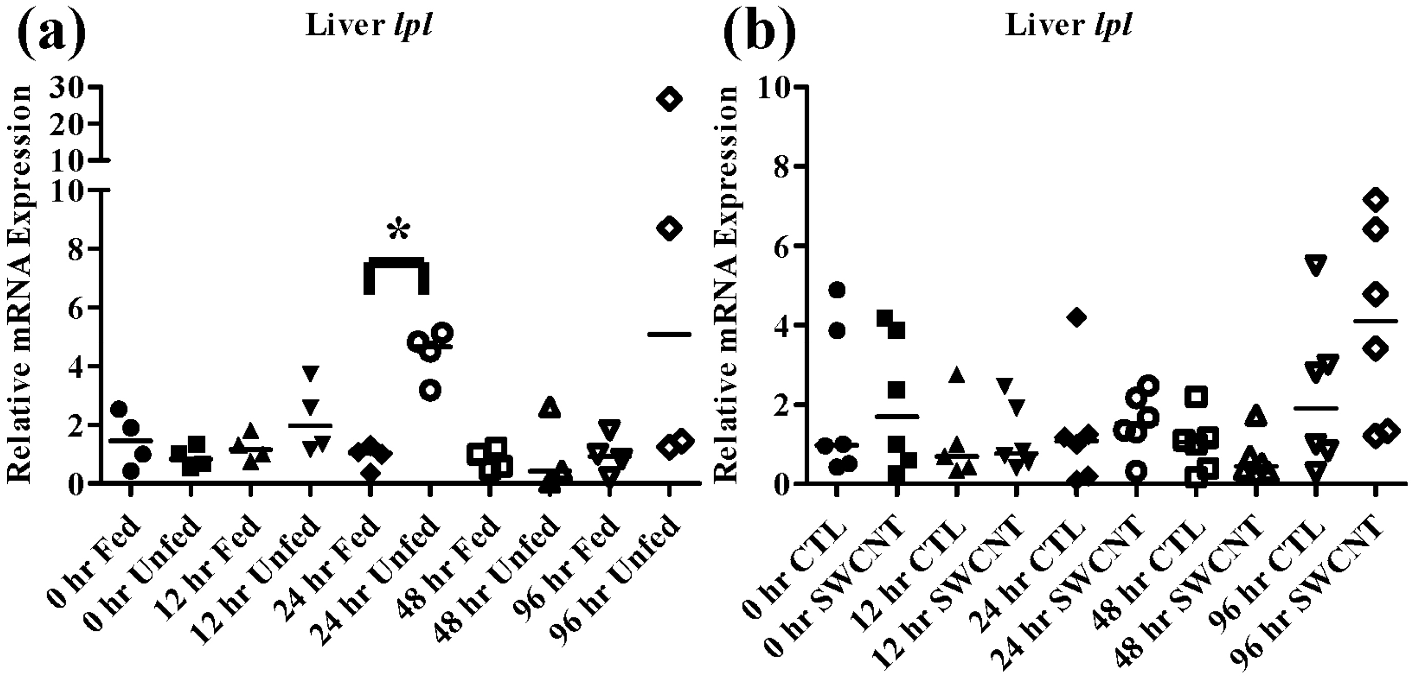Liver lpl mRNA expression of fed, vs. unfed and control vs. SWCNT fed FHMs. Expression of lpl mRNA expression was measured in the livers of FHMs under different experimental conditions. Expression of individual replicate fish is presented relative to the corresponding control at that time point. Solid lines for each time point and treatment represents the median value. Statistical comparisons were made between treatments for each time point within each intestinal section and statistically significant values marked by an asterisk (p < 0.05). (a) Relative lpl mRNA expression in fed and unfed FHM livers; (b) Relative cck mRNA expression in livers of FHMs fed either control or SWCNT diets.