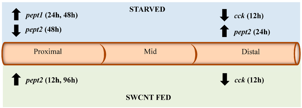 Summary of impacts of starvation and SWCNT diet on pept1, pept2, cck, and lpl expression. The diagram shows the direction of expression (arrows) and time (in parenthesis) for each gene in the proximal, middle and distal sections of the intestine for both starved and SWCNT fed conditions.