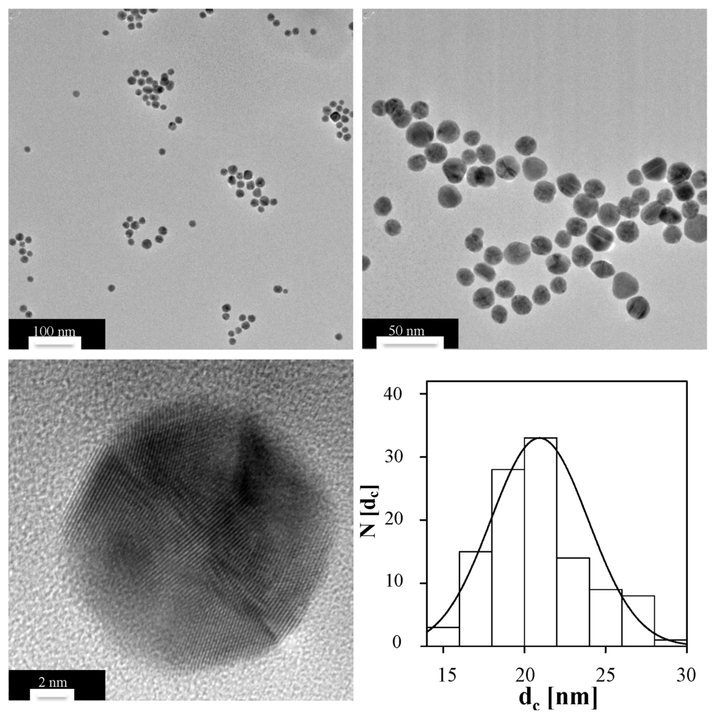 TEM images of the Au NPs at different magnifications (scale bars corresponding to 100 nm, 50 nm and 2 nm), and the corresponding histogram N (dc) of the core diameter dc.