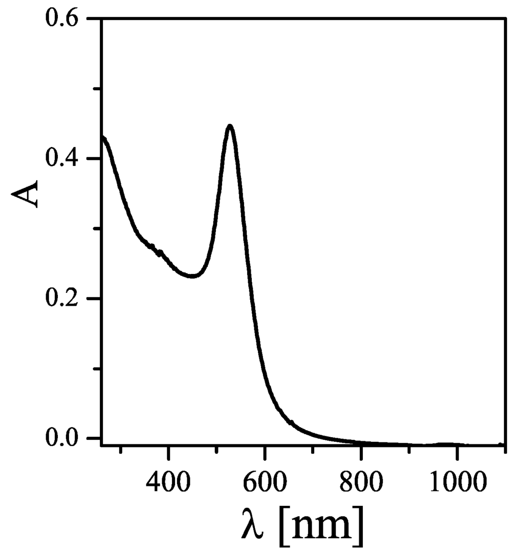 The state of dispersion cannot be unequivocally deduced from TEM images, as those are recorded on NPs in dried state. In other words, even well dispersed NPs can form clusters on TEM grids. While the most common method to probe for NP dispersion is measuring the hydrodynamic diameter directly in solution (for example by dynamic light scattering (DLS), as will be described later in more detail), in the case of Au NPs simple analysis can be done by recording UV/Vis absorption spectra. As shown in the absorption spectrum in Figure 2, Au NPs exhibit a peak due to surface plasmon resonance [18]. In case NPs are not well dispersed and start to form agglomerates, this peak is shifted to higher wavelengths and the solution turns from red to blue-black. Agglomeration also leads to scattering at high wavelengths >800 nm. In case of poor size distribution, the plasmon peak broadens.