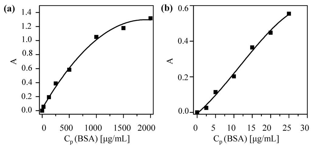 First, a calibration curve based on the Bradford assay [23] (Coomassie Blue, Thermo Scientific #23236, Hampton, NH, USA) to determine protein concentrations was obtained. Under the presence of proteins, a shift in the absorption spectrum of Coomassie Blue occurs and protein concentration is proportional (in a certain range) to the (offset-corrected) absorption A at 595 nm. The calibration curve was done following the fabricant specifications [24]. As protein standards, bovine serum albumin (BSA) was used (Thermo Scientific #23029). Two different calibration curves were recorded, one for high protein concentrations (working range of 100–1500 μg/mL protein concentrations CP) and a second one for low protein concentrations (working range 1–25 μg/mL protein concentrations CP). The standard solutions of different protein concentrations CP were prepared as indicated in the protocol, using 2-(N-Morpholino)ethanesulfonicacidhydrate (MES) pH 6.5 as buffer. Following the indication of the guide, in order to get the high concentration curve, 10 μL of NP solution sample were mixed with 300 μL of Coomassie reagent, previously equilibrated at room temperature. To obtain the low concentration curve instead of using 10 μL NP sample and 300 μLCoomassie reagent, 150 μL of sample and 150 μL of reagent were used. After mixing for 30 s and incubating for 10 min for each protein concentration, CP, the absorption of the protein—Coomassie Blue mix at 595 nm—was recorded with an UV/Vis absorption spectrometer (Agilent 8450 spectrometer, Palo Alto, CA, USA). Single-use plastic cuvettes were used to hold the samples. Samples were prepared by triplicate and measured individually. As an offset, the absorption of Coomassie Blue without protein was subtracted. The offset-corrected absorptions A are plotted versus the protein concentrations CP in Figure 4. A polynomial fit was applied to obtain the final calibration curves.