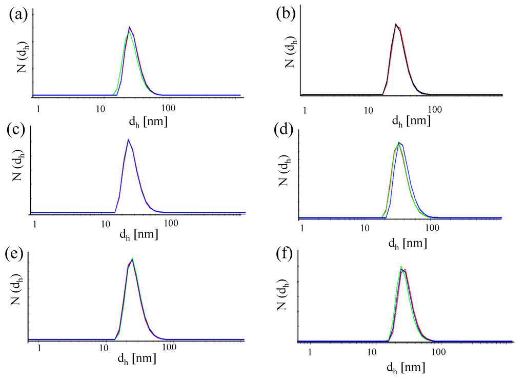 While UV/Vis absorption spectra can be a first indication about the presence of bigger agglomerates, it is hard to determine the existence of smaller agglomerates from these data. For this purpose, measurements of the hydrodynamic diameter dh of the NPs are best suited. One common technique in this direction is dynamic light scattering (DLS; Malvern Zetasizer set-up). However, in the case of small NPs, proteins have similar size to the NPs and thus measurements in cell culture media containing serum are complicated [31]. In Figure 9, DLS measurement for the NP-antibody conjugates are displayed. The hydrodynamic diameters dh as determined from these data (cf. Table 2) demonstrate that any larger agglomerates can be excluded. However, in general, no significant increase in size of the NPs upon antibody attachment could be observed, though the FITC fluorescence clearly proves the presence of the antibodies.
