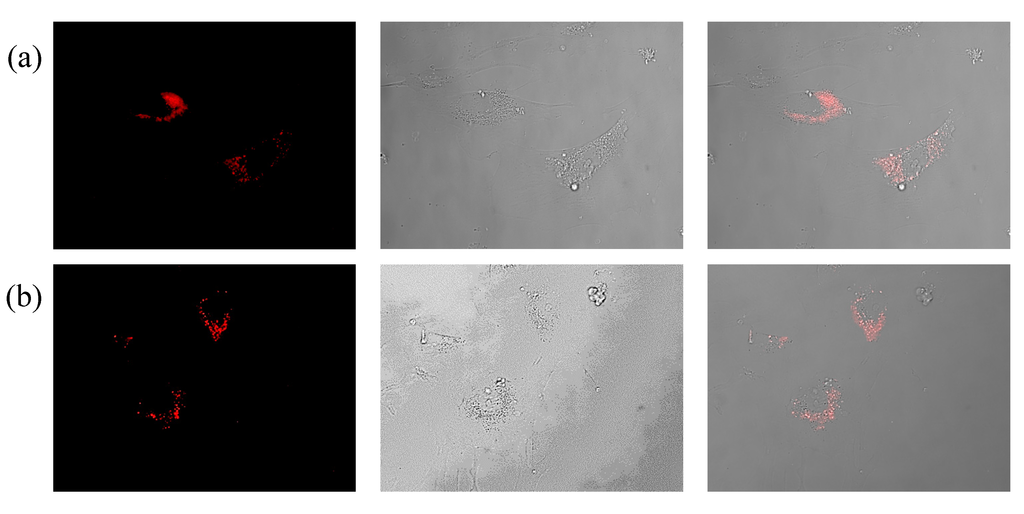 Internalization of functionalized Au NPs by human umbilical vein endothelial cells. HUVECs were exposed to TAMRA-labeled Au NPs functionalized with (a) anti-VEGF (Au-PEG-antiVEGF NPs), and (b) anti-HRP antibodies (Au-PEG-anti-HRP NPs). The NP-antibody conjugates were removed after 2 h and the cells were intensively washed. The images were taken 1 h later by employing a Zeiss fluorescent microscope. Images show the fluorescence and bright field channel, as the overlay of both channels.