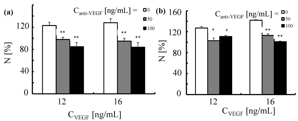 Proliferation of human umbilical vein endothelial cells triggered by VEGF and neutralization induced by anti-VEGF antibody. HUVECs were first exposed for 2 h to anti-VEGF antibody at two concentrations (Canti-VEGF = 50 and 100 ng/mL). This was followed by the incubation with VEGF (CVEGF = 12 and 16 ng/mL) for (a) 24 and (b) 48 h. The number of cells was normalized to 100% for untreated control cells. *p < 0.01; **p < 0.001(versus cells treated with VEGF only).