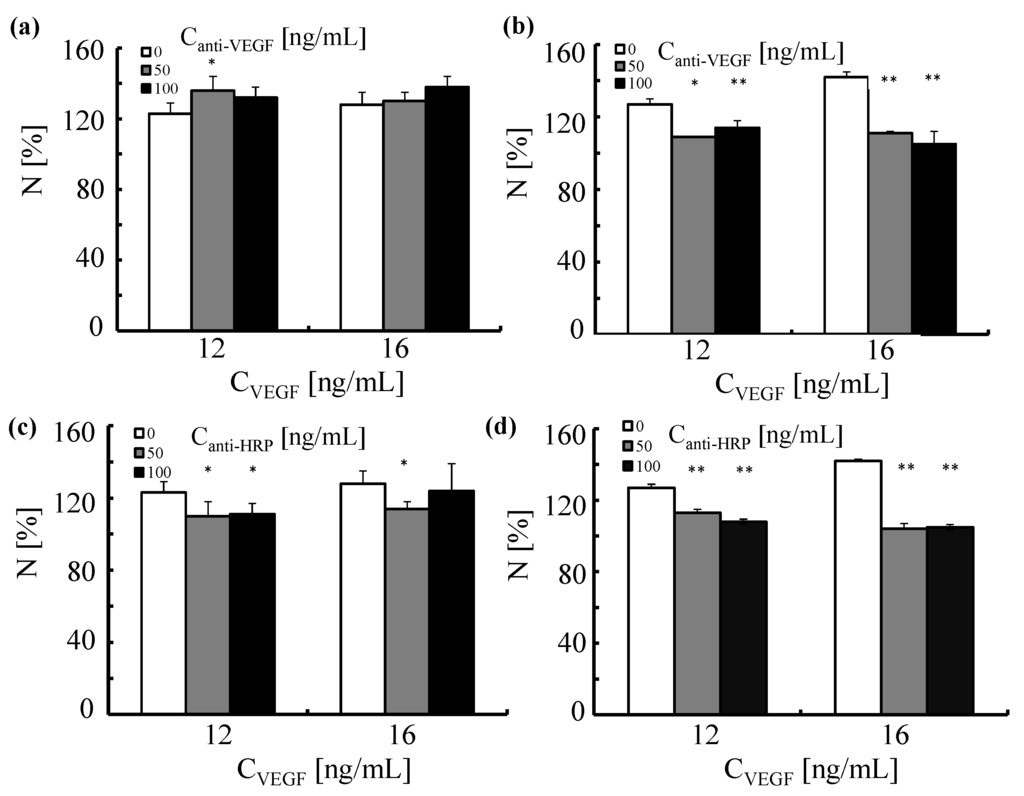 Under physiological conditions VEGF binds to its receptor (VEGFR) present on the membrane of HUVECs, which initiates cascades of signals that stimulate many processes including angiogenesis [33,34]. VEGF receptors convey information to other signal transduction molecules via autophosphorylation of distinct residues in their structure. If VEGF binds to its receptor, HUVECs proliferate. If one blocks the receptor with an antibody [33,35] or NP [36,37], there is reduced proliferation. Antibody-based therapies relay on a sequestering of VEGF molecules by specific antibodies. In this way, VEGF binding to its receptor is prevented [38].