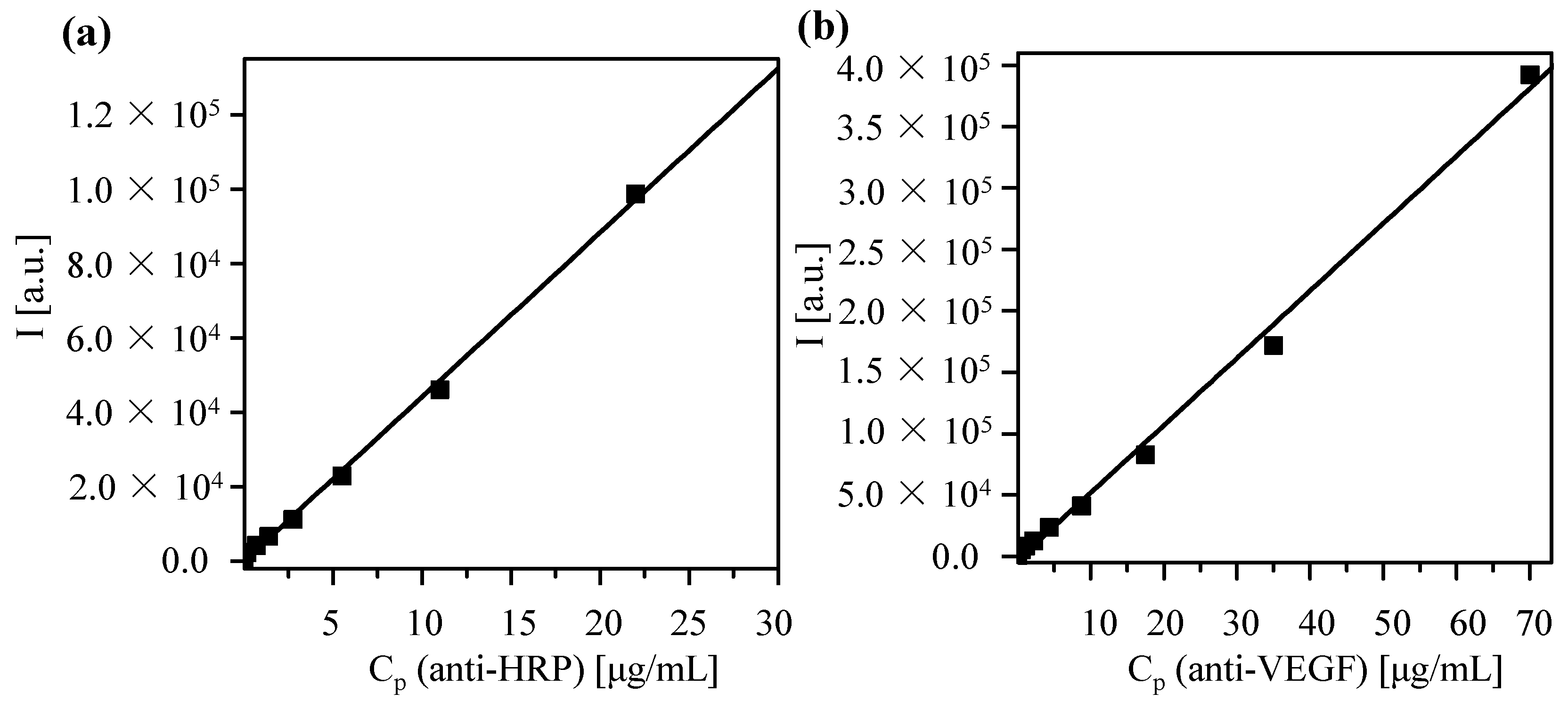 Calibration curve in which the fluorescence intensity I at 519 nm is determined for protein solutions of different concentration CP. Data are shown for antibodies against (a) horseradish peroxidase (HRP) and (b) vascular endothelial growth factor (VEGF). A linear fit leads to the following correlation between fluorescence intensity I and concentration CP: (a) I(CP) = I0 + (ΔI/ΔCP)·CP = −464.28 + (4447.1 mL/µg)·CP; (b) I(CP) = −3549.4 + (5498.3 mL/µg)·CP. The coefficients of determination (r2) are equal to 0.998 and 0.995 for HRP and VEGF, respectively.