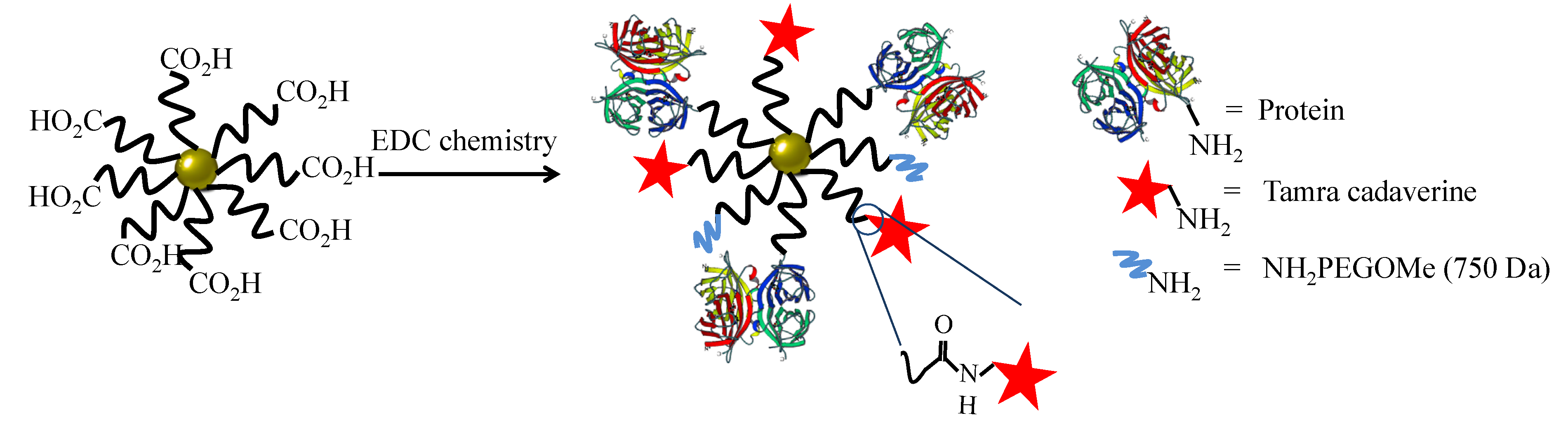 27]. In other words, three different ligands (proteins, TAMRA, PEG) were attached to the PEGylated NPs using EDC chemistry. The ratios were chosen that