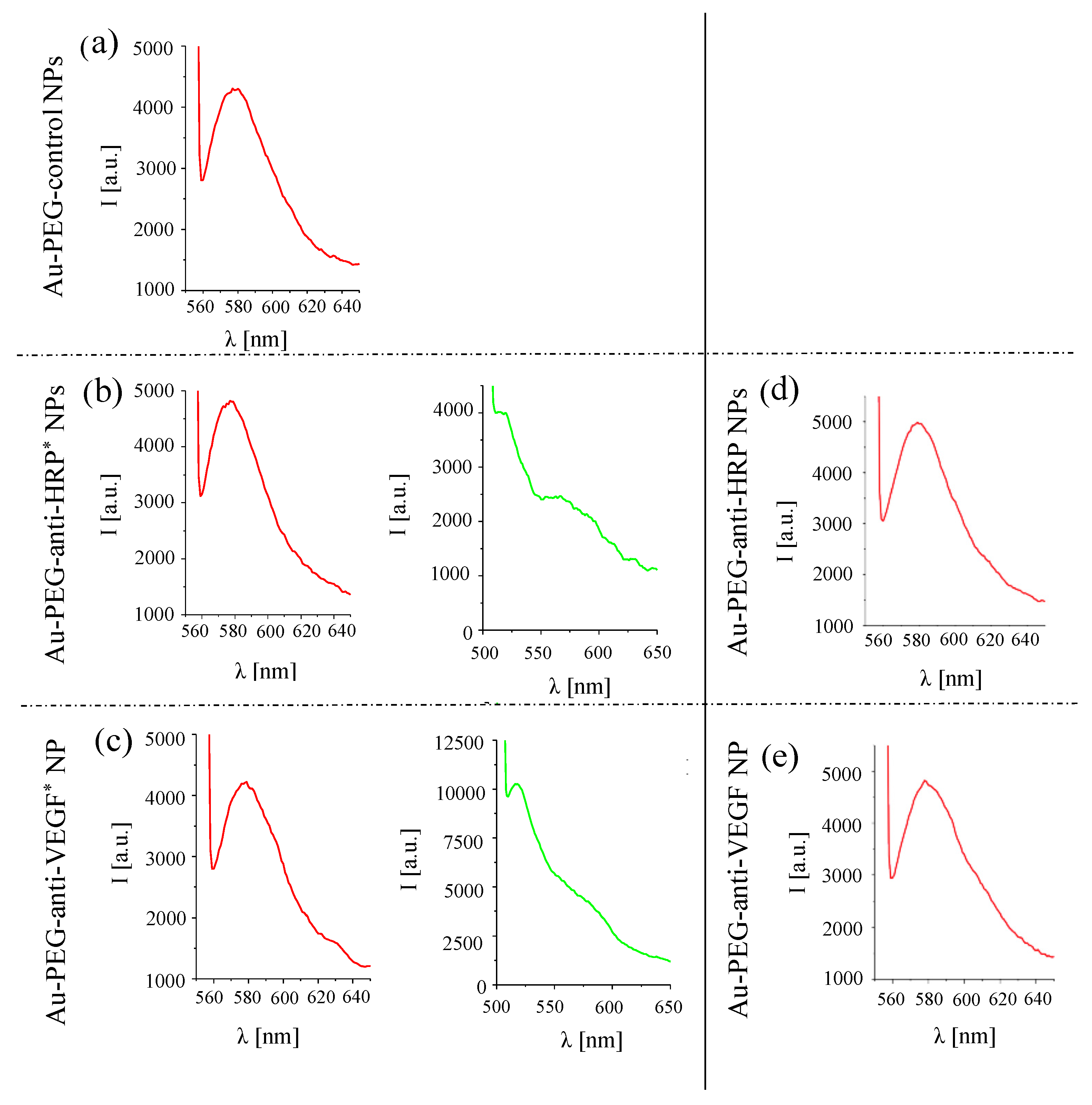 | Sample | Au-PEG NPs | Au-PEG-Control NPs | Au-PEG-anti-HRP* NPs | Au-PEG-anti-VEGF* NPs | Au-PEG-anti-HRP NPs | Au-PEG-anti-VEGF NPs |