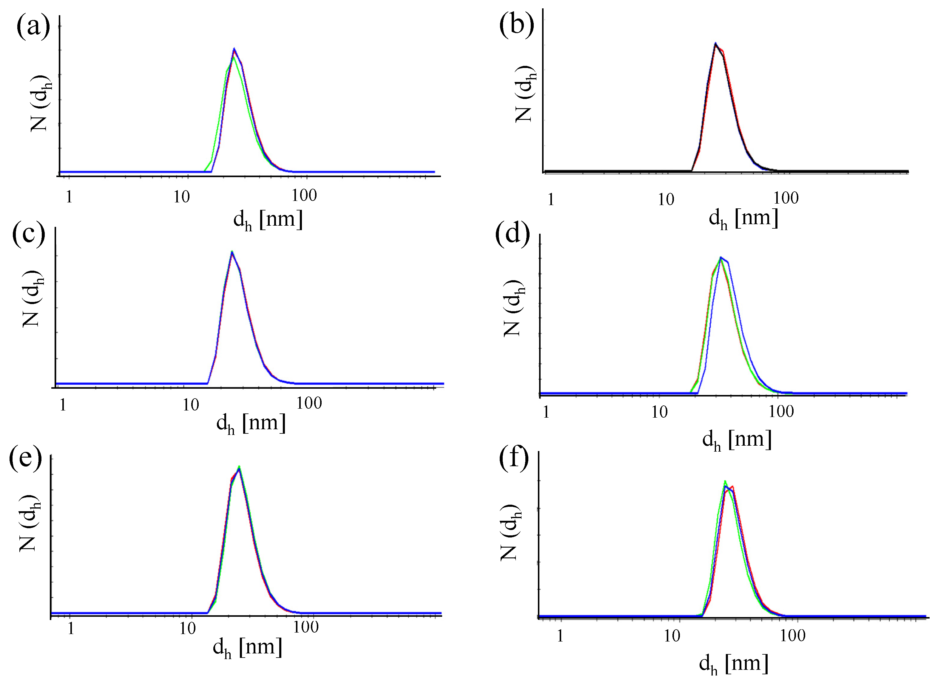 Number distribution N (dh) of the hydrodynamic diameter recorded or different NPs. (a) Au-PEG NPs, (b) Au-PEG-control NPs, (c) Au-PEG-anti-HRP* NPs, (d) Au-PEG-anti-VEGF* NPs, (e) Au-PEG-anti-HRP NPs, and (f) Au-PEG-anti-VEGF NPs. The concentration of the NP solutions were cNP ≈ 5 nM, and the measurements were performed in milliQ water. Each sample was measured at least three times and the mean value of the hydrodynamic diameter was determined.