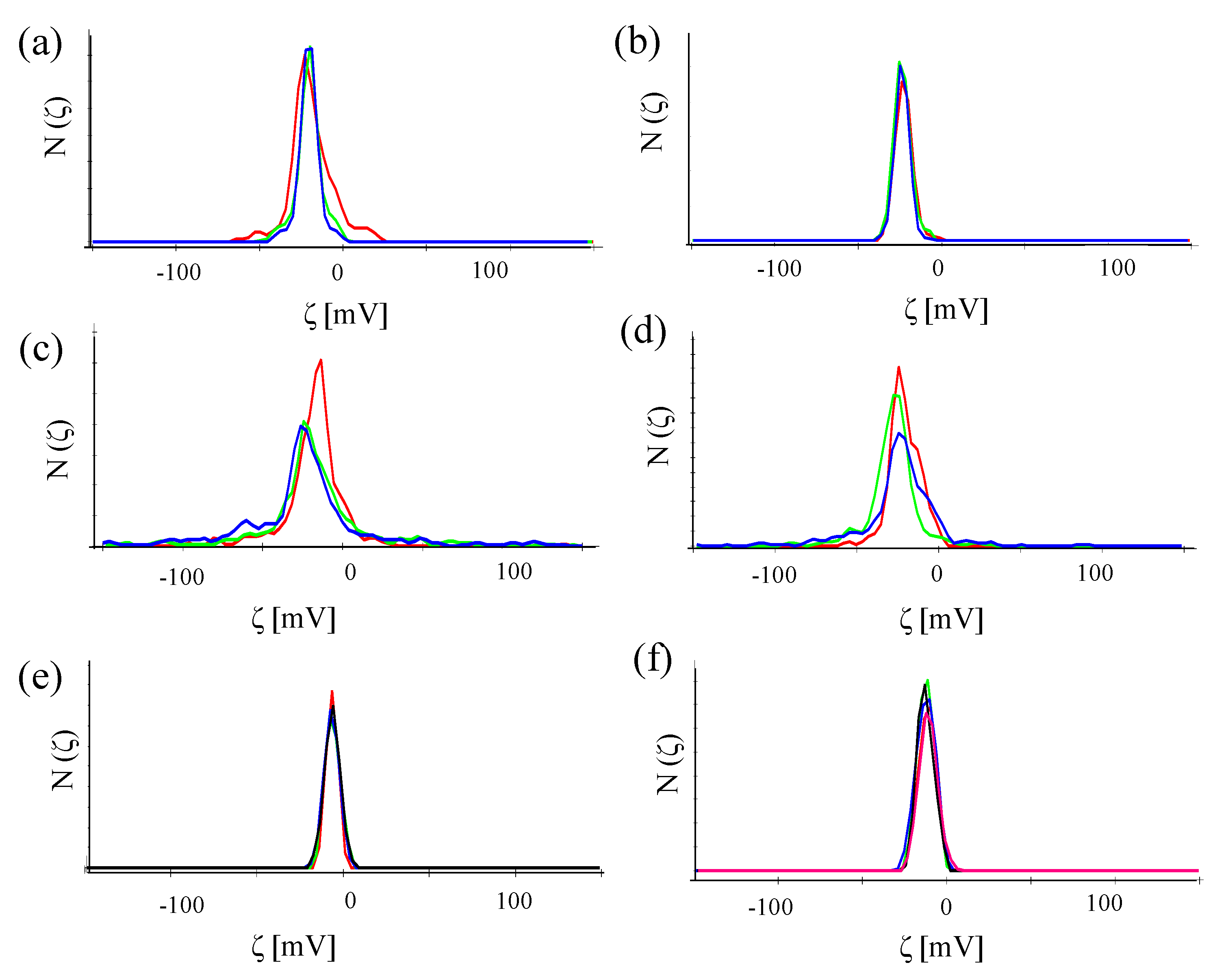 Number distribution N (ζ) of the zeta-potential of (a) Au-PEG NPs, (b) Au-PEG-control NPs, (c) Au-PEG-anti-HRP* NPs, (d) Au-PEG-anti-VEGF* NPs, (e) Au-PEG-anti-HRP NPs, and (f) Au-PEG-anti-VEGF NPs. The concentration of the NP solutions were cNP ≈ 5 nM, and the measurements were performed in milliQ water. Each sample was measured at least three times and the mean value of the zeta-potential was determined.