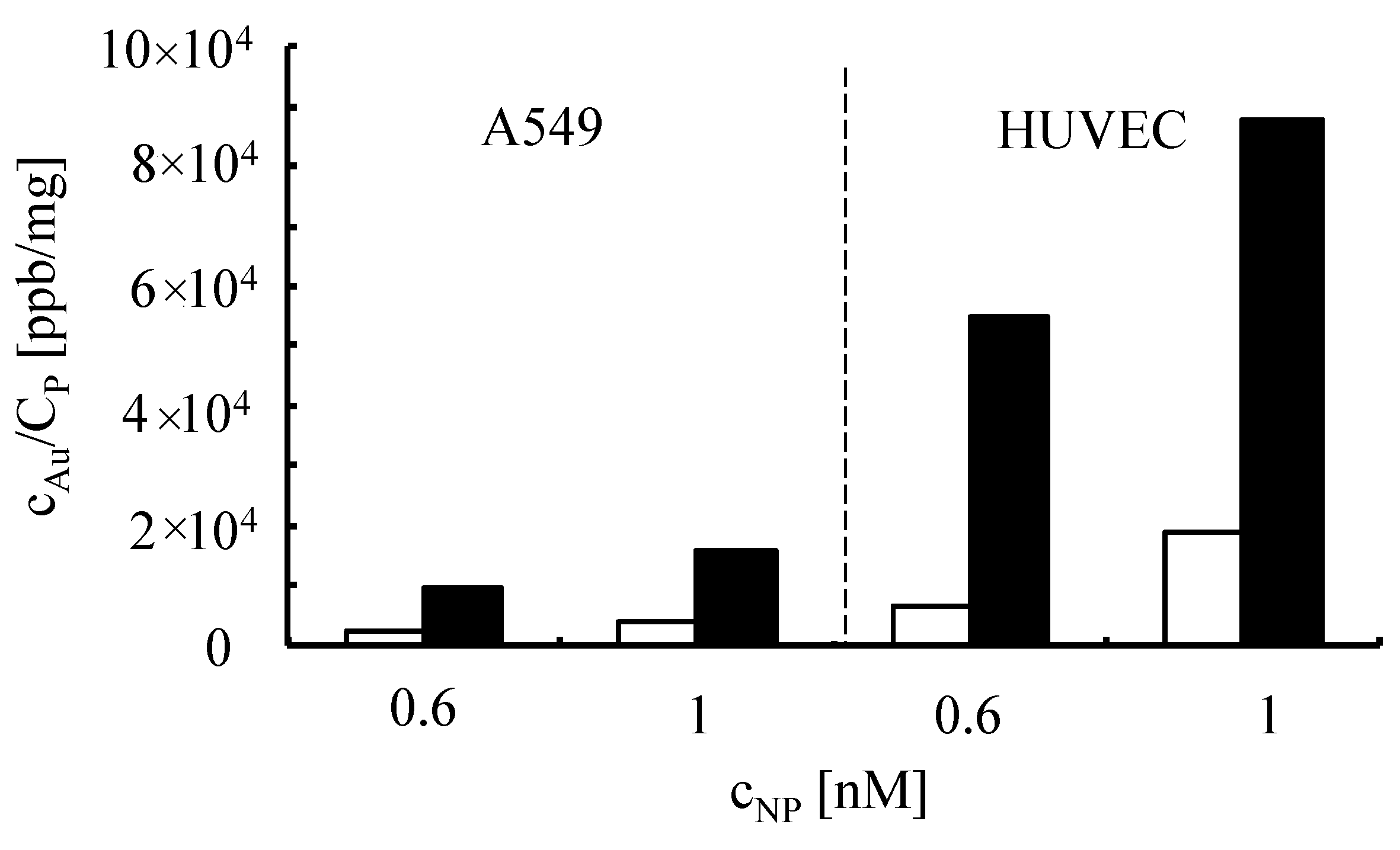 Internalization of Au-PEG NPs by A549 cells and HUVECs. A549 cells and HUVECs were incubated with Au-PEG NPs of cNP = 0.6 nM and cNP = 1 nM concentration cells in medium with (white bars) or without (black bars) serum. Twenty-four hours after adding the particles, the gold concentration cAu and the protein concentration CP was determined.