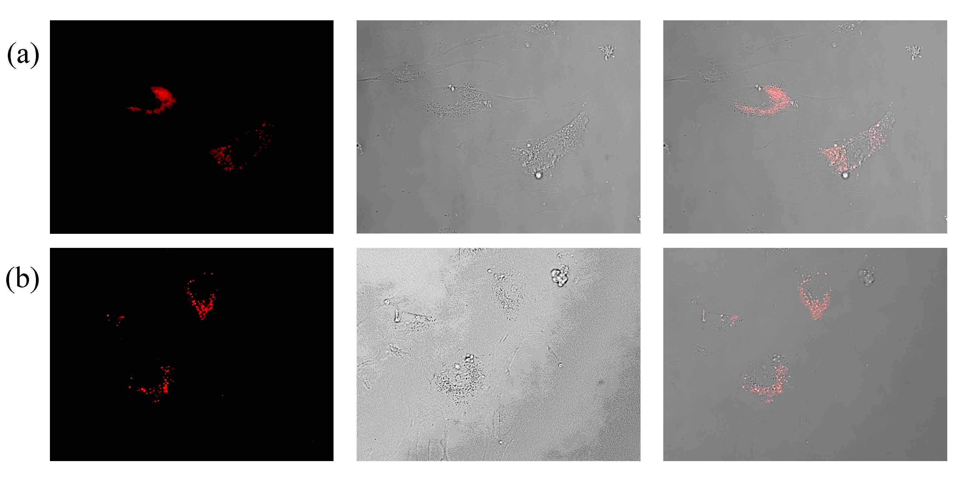 Internalization of functionalized Au NPs by human umbilical vein endothelial cells. HUVECs were exposed to TAMRA-labeled Au NPs functionalized with (a) anti-VEGF (Au-PEG-antiVEGF NPs), and (b) anti-HRP antibodies (Au-PEG-anti-HRP NPs). The NP-antibody conjugates were removed after 2 h and the cells were intensively washed. The images were taken 1 h later by employing a Zeiss fluorescent microscope. Images show the fluorescence and bright field channel, as the overlay of both channels.