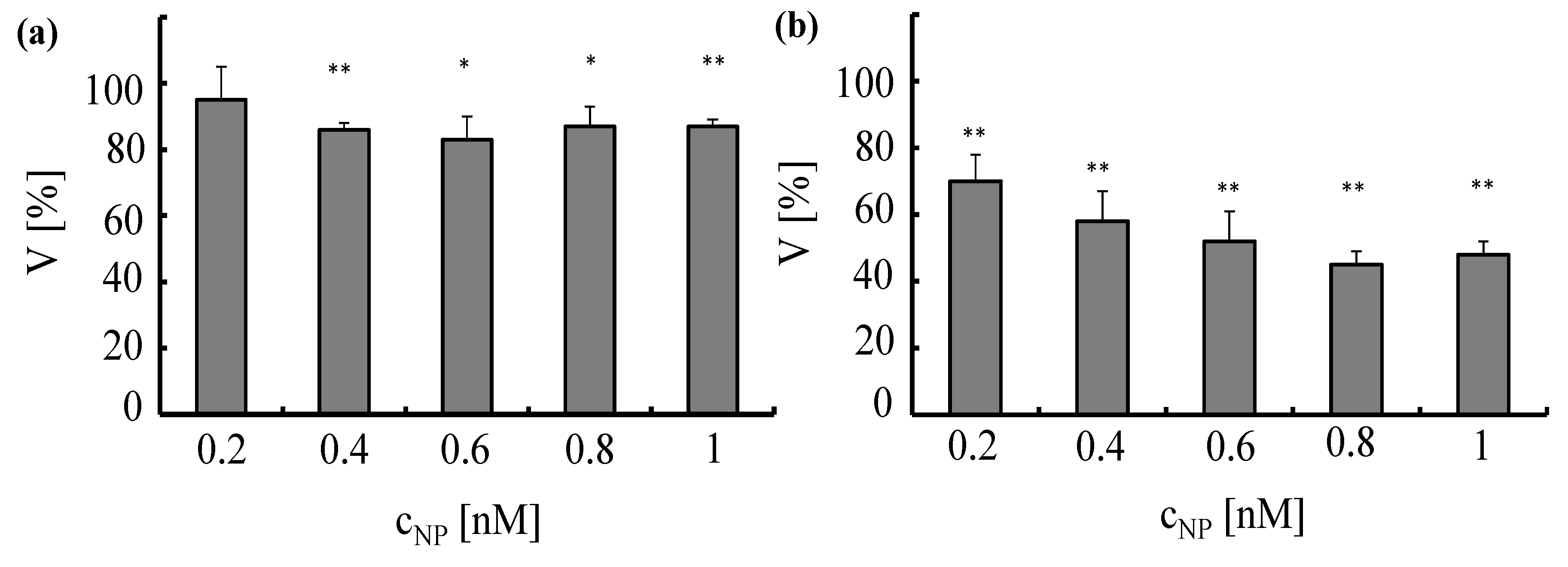 Toxicity induced by Au-PEG NPs in A549 cells (a) and HUVECs (b)Au-PEG NPs, at concentrations ranging from cNP = 0.2 to 1 nM, were incubated for 4 h with A549 cells or HUVECs in media containing serum. Cell viability (V) was determined 24 h after adding the NPs to the cells. The viability was normalized to 100% for untreated control cells, *p < 0.01; **p < 0.001(versus control value).
