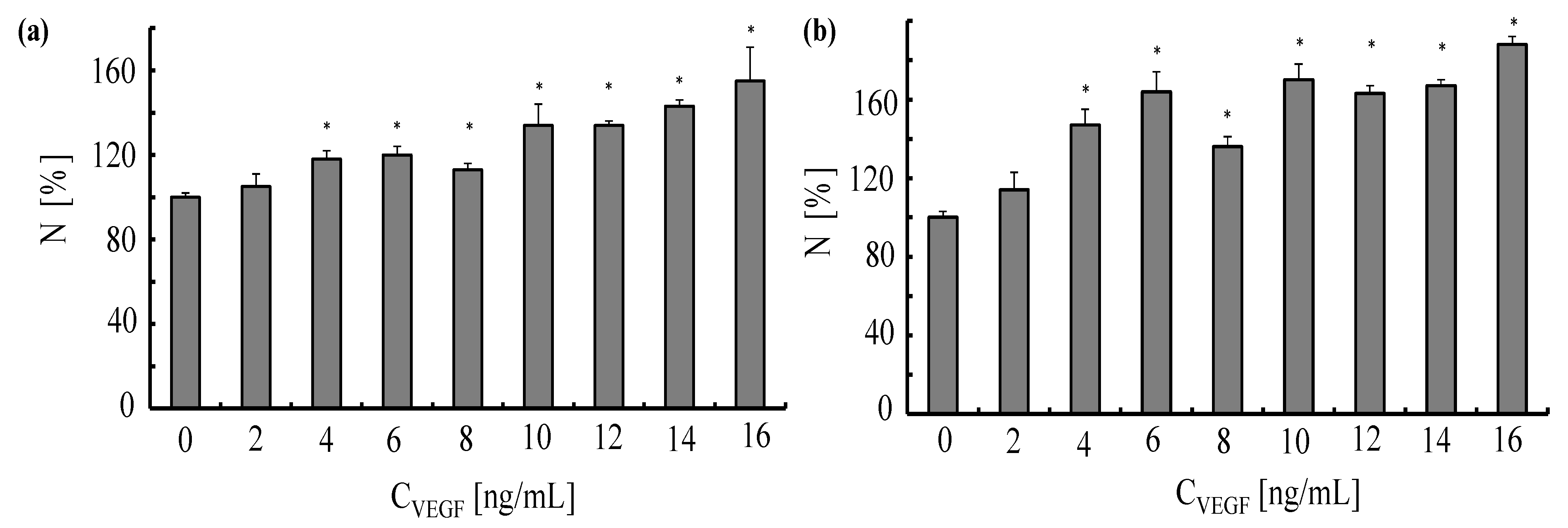 Response of human umbilical vein endothelial cells to vascular endothelial growth factor. The endothelial cells were plated in 96-well plates (5000 cells/well) one day before planned experiments. The cells were exposed for 24 h (a) and 48 h (b) to different concentrations CVEGF of VEGF. The normalized numbers of cells N in culture were evaluated by performing a proliferation test. Data correspond to the mean value ± standard deviation obtained from n = 4 experiments, *p < 0.001 (versus control value, no VEGF).