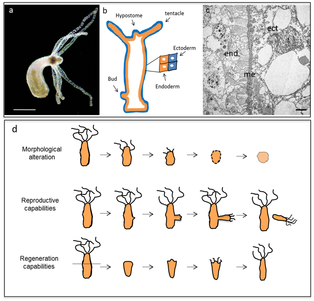 Structural anatomy of Hydra vulgaris. (a) The Hydra polyp is structured as a single hollow and transparent tube with a foot responsible for the anchoring to a substrate and a mouth surrounded by a crown of 6–8 tentacles. Scale bar, 500 µm. (b) Schematic representation of Hydra tissue organization with the inner endoderm (end) and an outer ectoderm (ect) separated by an acellular matrix, the mesoglea (me). The same structure is shown by transmission electron microscopy (c) of tissue cross sections. Scale bar, 10 µm. (d) Developmental potential of Hydra vulgaris.