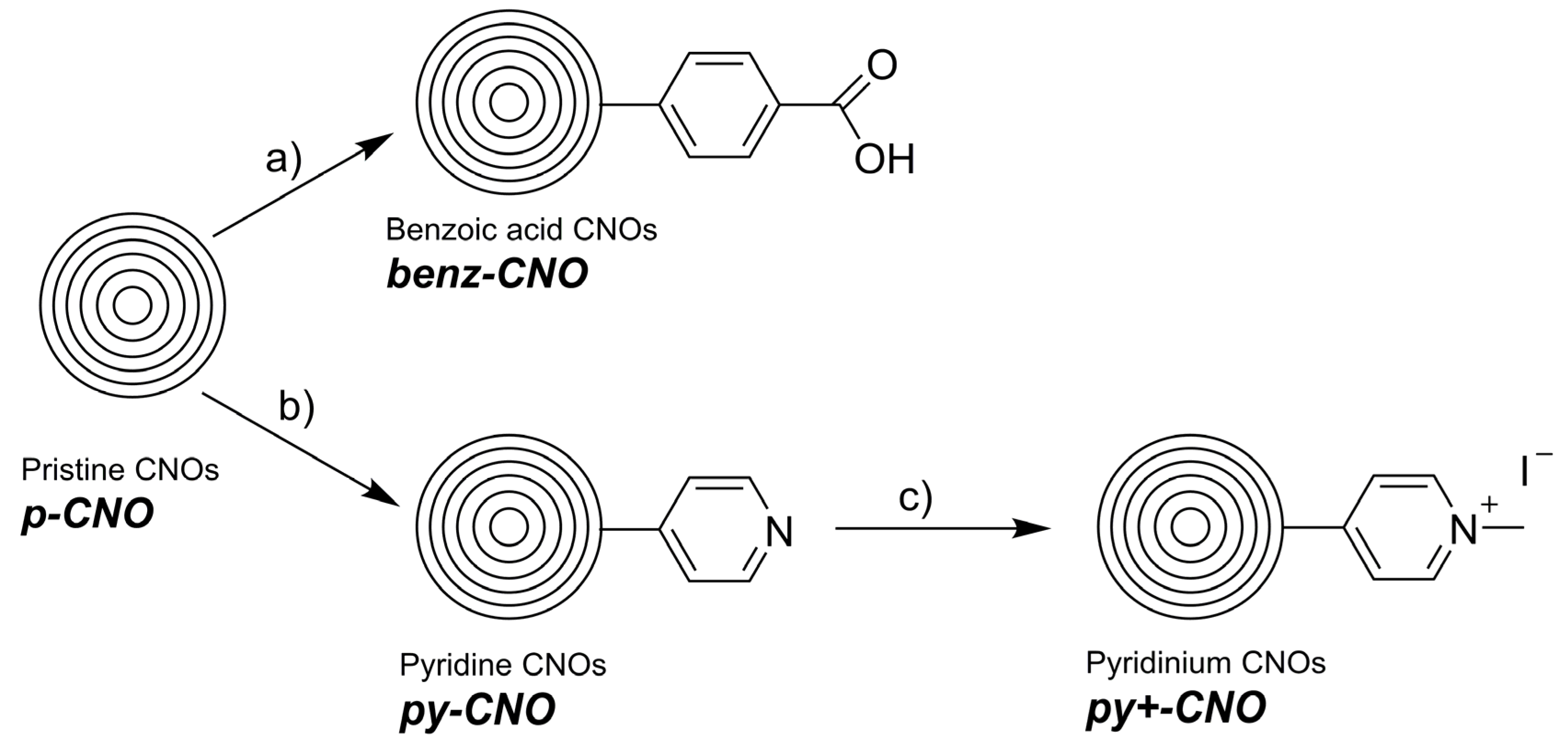 Scheme of synthetic procedures for the surface functionalization of pristine CNOs. (a) 4-Aminobenzoic acid, NaNO2, HCl, dimethylformamide/water; (b) 4-Aminopyridine, NaNO2, 4 N HCl/dimethylformamide. (c) Iodomethane, acetonitrile. All CNOs contain multiple functionalities on the surface; this scheme is simplified.