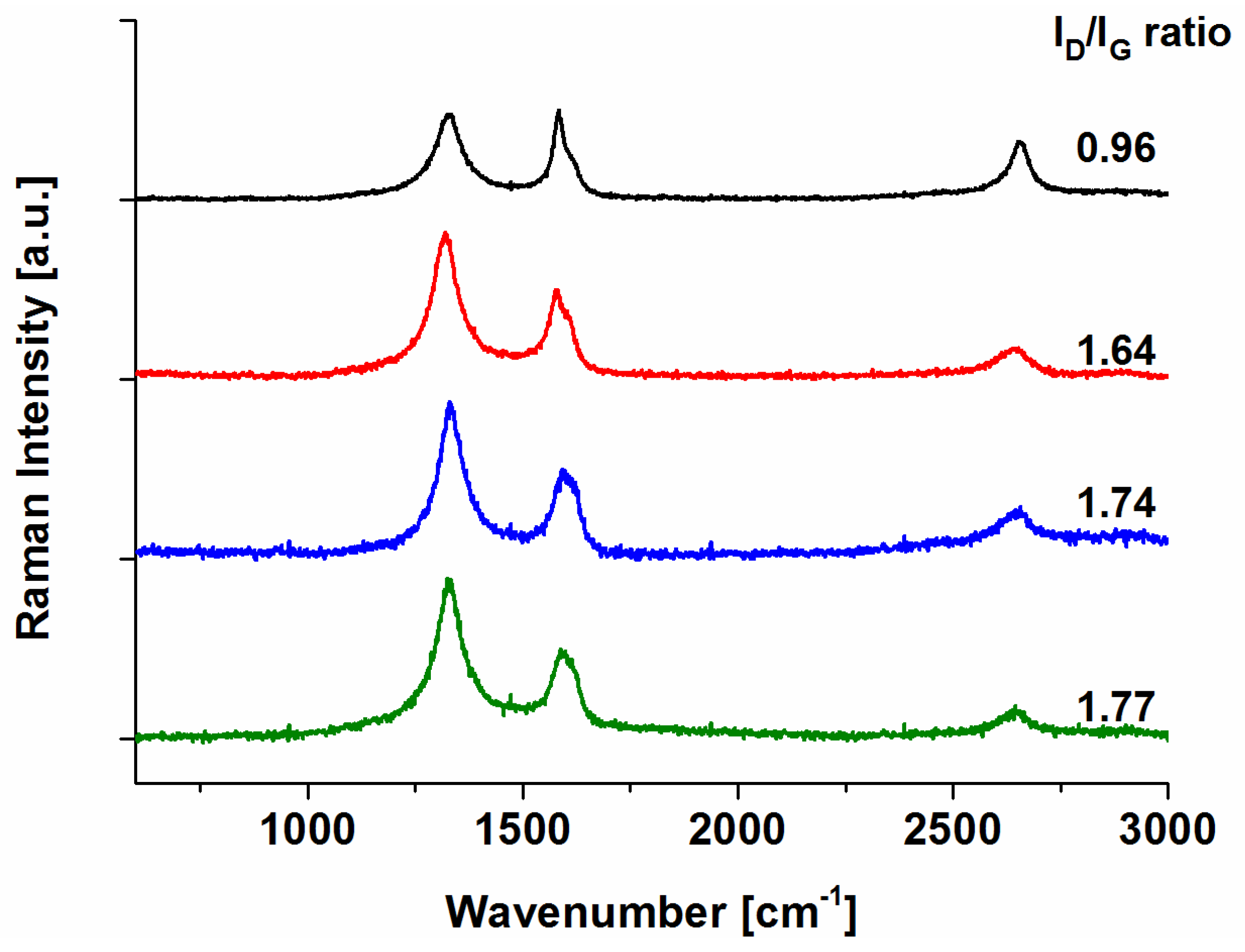 The benzoic functionalized and the pyridine functionalized CNOs were synthesized following the so-called Tour-reaction from in situ prepared diazonium salts of 4-aminobenzoic acid or 4-aminopyridine, respectively, and p-CNO. The pyridinium functionalized CNO derivative (py+-CNO) was prepared by reacting py-CNO with iodomethane (Figure 2). All reactions led to functionalized CNO nanomaterials as black powders, which were characterized by TGA, DLS and Z-potential, FT-IR and Raman spectroscopies. Atomic Force Microscopy and Transmission Electron Microscopy studies were previously conducted to get the size distribution of the CNOs. The presented data unambiguously revealed a size of about 5 nm in diameter (over 100 individual CNOs were analyzed) [23]. Raman spectra of functionalized CNOs display an enhancement of the D-band (1320 cm−1) compared to the G-band (1580 cm−1), confirming the functionalization of the CNO’s graphitic structure [15]. The ID/IG ratio (Raman intensity of the D-band vs. the G-band) increases from a value of 0.96 for p-CNO to values of 1.64 and 1.74 for benz-CNO and py-CNO respectively (Figure 3). As expected the methylation of the pyridine moiety of the py-CNO, leading to py+CNO, did not alter the ID/IG ratio significantly. FT-IR spectra of all CNOs are presented in Figure S1. While p-CNO did not show any notable IR absorption bands, despite the broad plasmonic CNO absorption over the whole spectral area, the surface functionalization of the CNOs revealed weak but notable IR bands. However, the strong background absorption of the CNOs resulted in weakly established IR absorption features, making it difficult to clearly identify specific functional groups. Thermogravimetric analysis (TGA) confirmed the successful functionalizations. All functionalized CNOs show a decrease in the decomposition temperature and an increase in weight loss at 400 °C compared to pristine CNOs (Table S1, Figure S2). In order to explore the effect of the functionalization on the surface charge of the CNOs, the Z-potentials were determined. The Z-potentials were found to be −39.9 mV (±4.4 mV) for benz-CNO and −31.1 mV (±4.7 mV) for py-CNO. The methylation of the pyridine moiety had a significant effect on the Z-potential which was found to be −2.9 mV (±5.9 mV) for py+-CNOs, confirming the formation of pyridinium cations. The observed dispersibility for the negatively charged benz-CNO and py-CNO was significantly better than for py+-CNO. The almost neutral surface charge of py+-CNO led to an increased tendency to form aggregates. Dynamic light scattering (DLS) experiments corroborated these findings. While benz-CNOs and py-CNOs were found to have average hydrodynamic radii between 450 and 550 nm, when being dispersed in phosphate buffered saline (PBS), py+-CNOs revealed larger hydrodynamic radii of about 750 nm. When determining the hydrodynamic radii of the CNO agglomerates in Hydra medium, smaller agglomerates are observed for benz-CNOs. benz-CNOs revealed much smaller values at around 250 nm, while py-CNOs showed hydrodynamic radii at around 500 nm, relatively similar to the values observed in the PBS buffer. Py+-CNOs, however, showed slightly larger hydrodynamic radii in the Hydra medium with values at around 800 nm. A rational explanation for the observed differences is the low concentration of dissolved salts in the Hydra medium, compared to PBS, next to a different pH. This aspect, together with the different surface modifications of the CNO nanoparticles is of great importance for the behavior of CNOs dispersed in any aqueous medium, thus rendering our approach of studying and comparing differently functionalized CNOs of high significance.