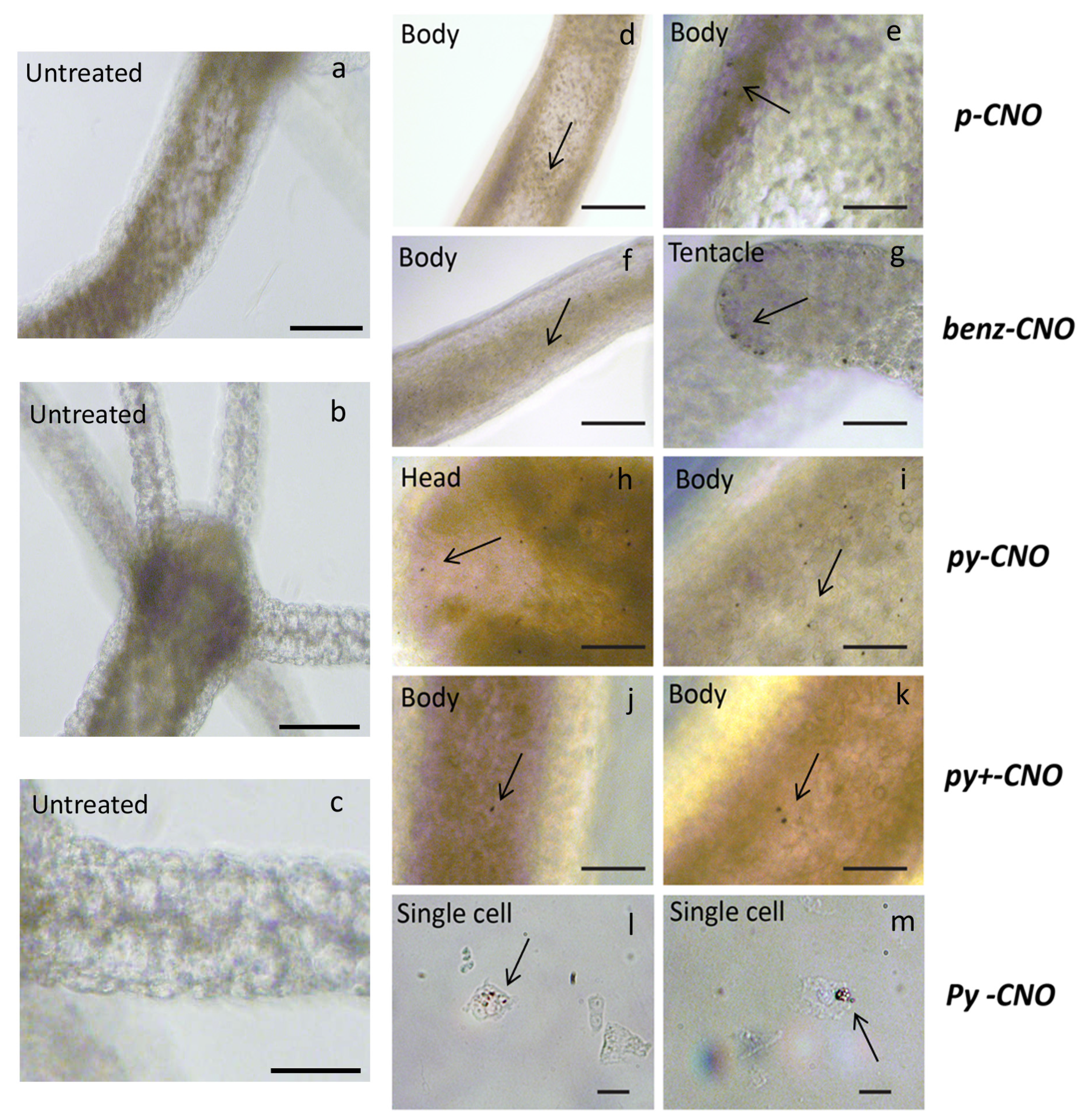 In vivo uptake and biodistribution of CNO nanoparticles in Hydra. (a–c) Bright field images of a living untreated polyp. Scale bar: 200 µm. (d–m) All different types of CNOs were internalized into Hydra tissues, and images show small differences in the uptake efficiency. Internalized CNOs appear as black granular structures and are present in the tentacles, heads and body columns. Scale bars: 500 µm in (f); 50 µm in (g); 200 µm in (e,h–k). Single cell suspensions obtained from treated animals show a granular structure within the cytoplasm of epithelial cells, suggesting a macropynocitosis mechanism mediating the entrance of large amounts of CNOs into the cells. Representative single cells obtained by animals treated with py-CNO are shown. Scale bar: 20 µm in (l,m).