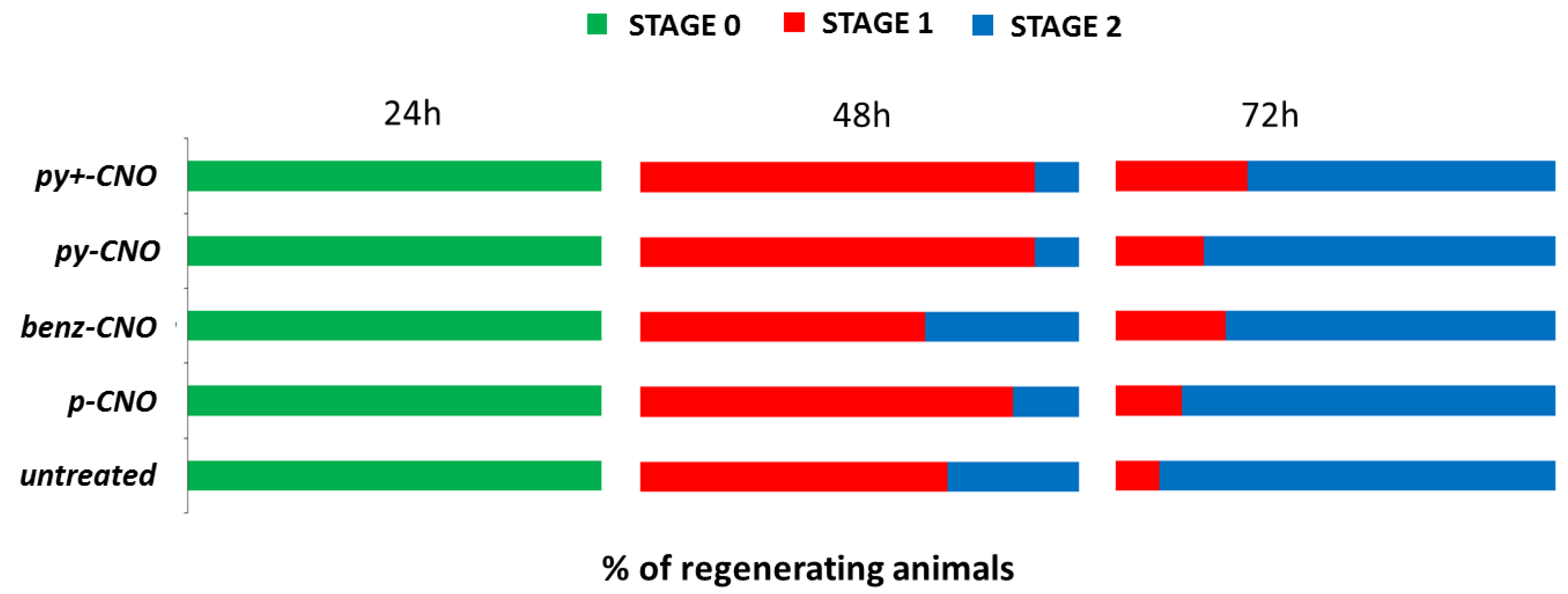 Effect of CNOs on the regenerative potential of Hydra. Groups of 25 polyps were bisected in the upper gastric region and incubated in the presence of 0.05 mg/mL of CNO. The regenerating polyps, monitored through a stereomicroscope, were grouped into three stages according to their tentacle morphogenetic process [54]. Nanoparticle treatment did not impair the regenerative potential of Hydra since no differences were observed in the percentage of regenerating animals between treated and untreated polyps, relative to each stage. The graph is representative of three independent biological replicate (total number of polyps: 75). No significant differences were found between treatments.