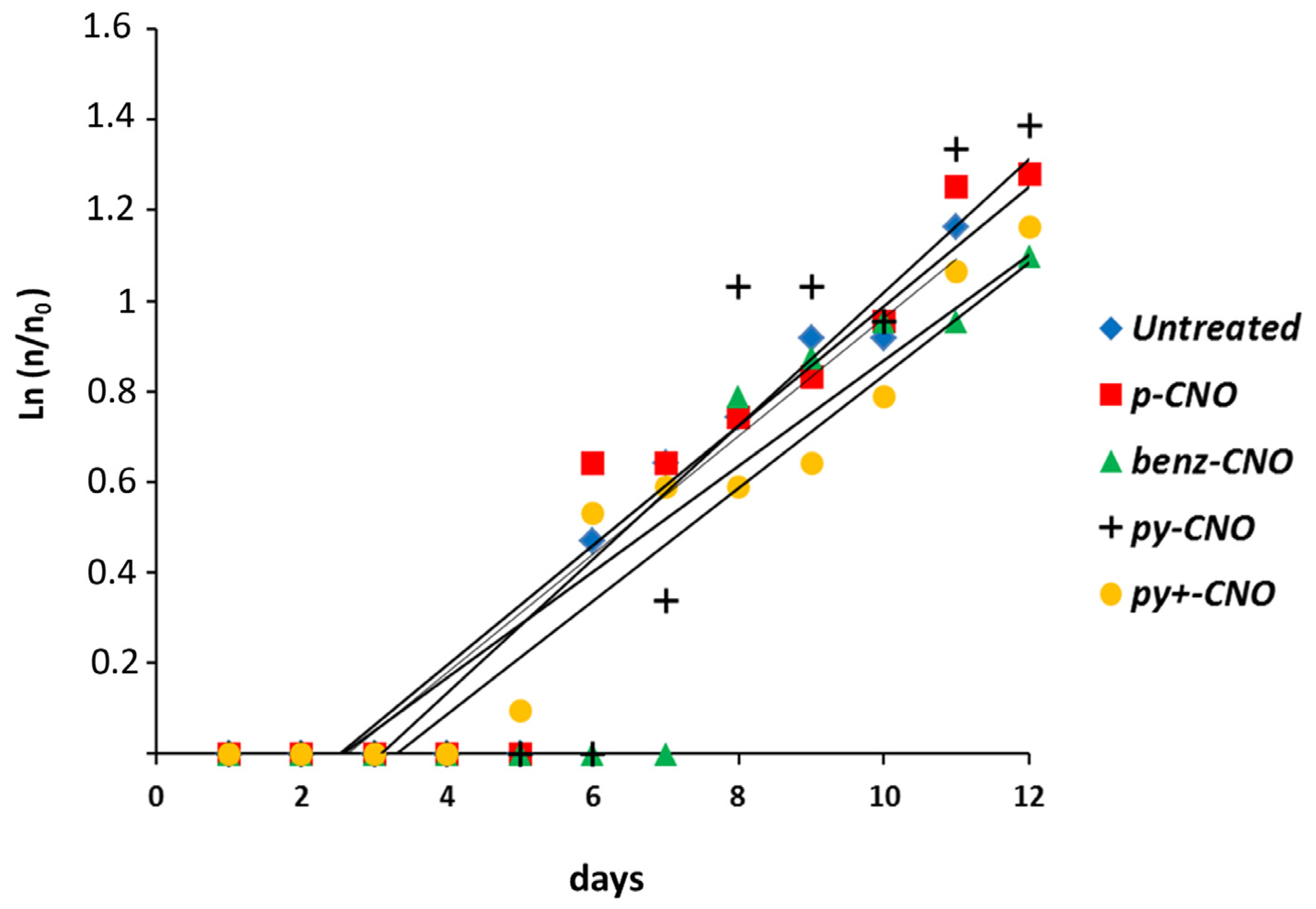Effect of CNOs on the asexual reproductive potential of Hydra. Five Hydra founders, untreated or incubated for 24 h with 0.05 mg/mL of CNOs, were washed out and monitored every day for bud growth and detachment. The graph shows n/n0 values at each time point. No significant differences in the growth rate between treated and untreated animals was observed, indicating the absence of CNO toxicity on a long term scale. By comparing linear regression slopes (ANOVA two-way test; p < 0.005), no significant differences were found between growth rates of Hydra populations exposed to CNOs.