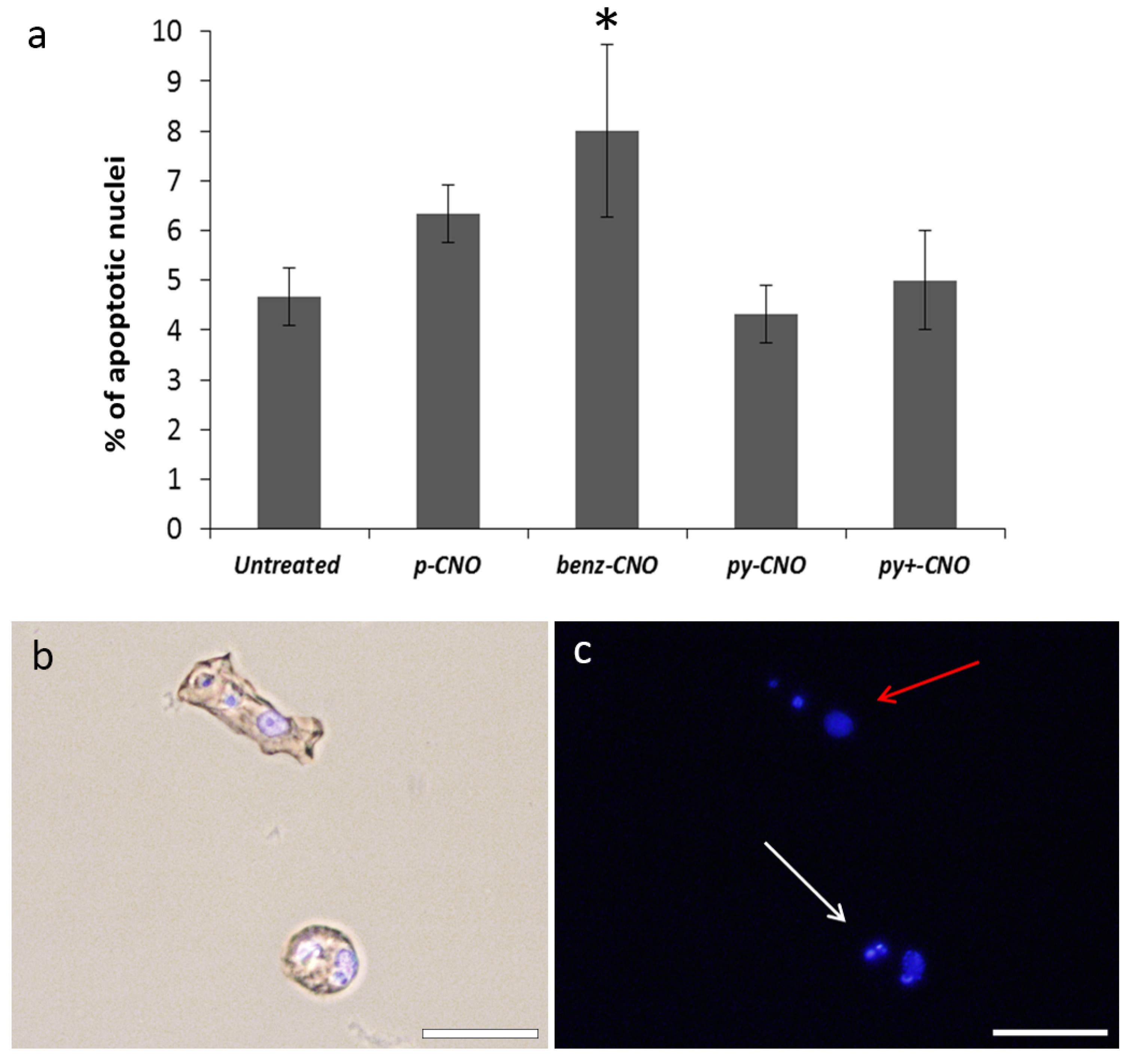 We evaluated the effects of CNO exposure on apoptosis by monitoring nuclear morphology by fluorescence microscopy. The process through which a cell undergoes during programmed death is called apoptosis and is characterized by a precise sequence of events including nuclear condensation, activation and cleavage of caspases, finally leading then to cell death. Apoptosis is a physiological phenomenon that is used by metazoans to regulate the number of cells in growing tissues and it turns out to be a key developmental program employed by Hydra polyps to control cell proliferation in response to feeding, regeneration and non-self cell removal. The remarkable similarity observed for the apoptotic cells and the overall apoptosis mechanism (caspases involved, positive and negative regulators) between Hydra and higher metazoans shows how conserved and evolutionarily important this mechanism is [76].