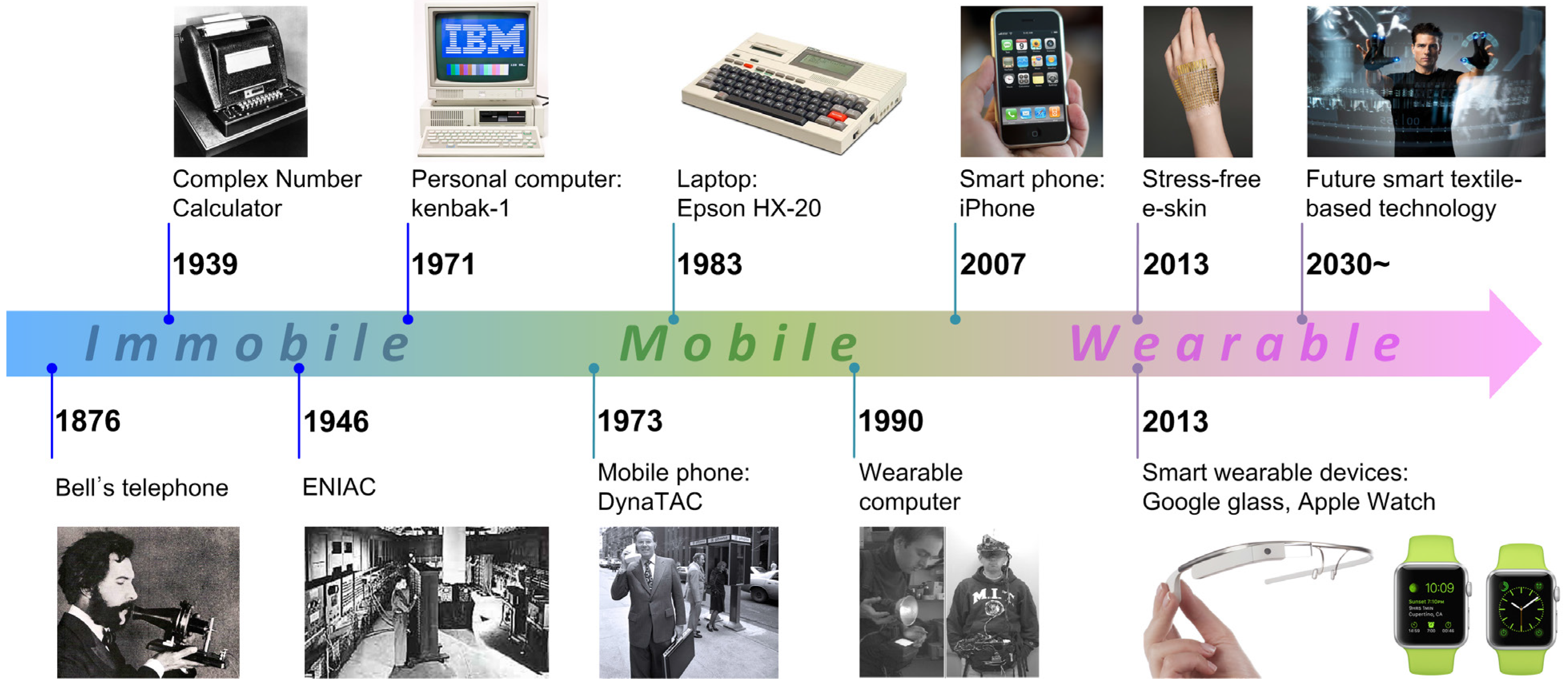 A chronological illustration presenting the journey of electronic components from immobile to mobile, and finally to wearable textile-based electronics.