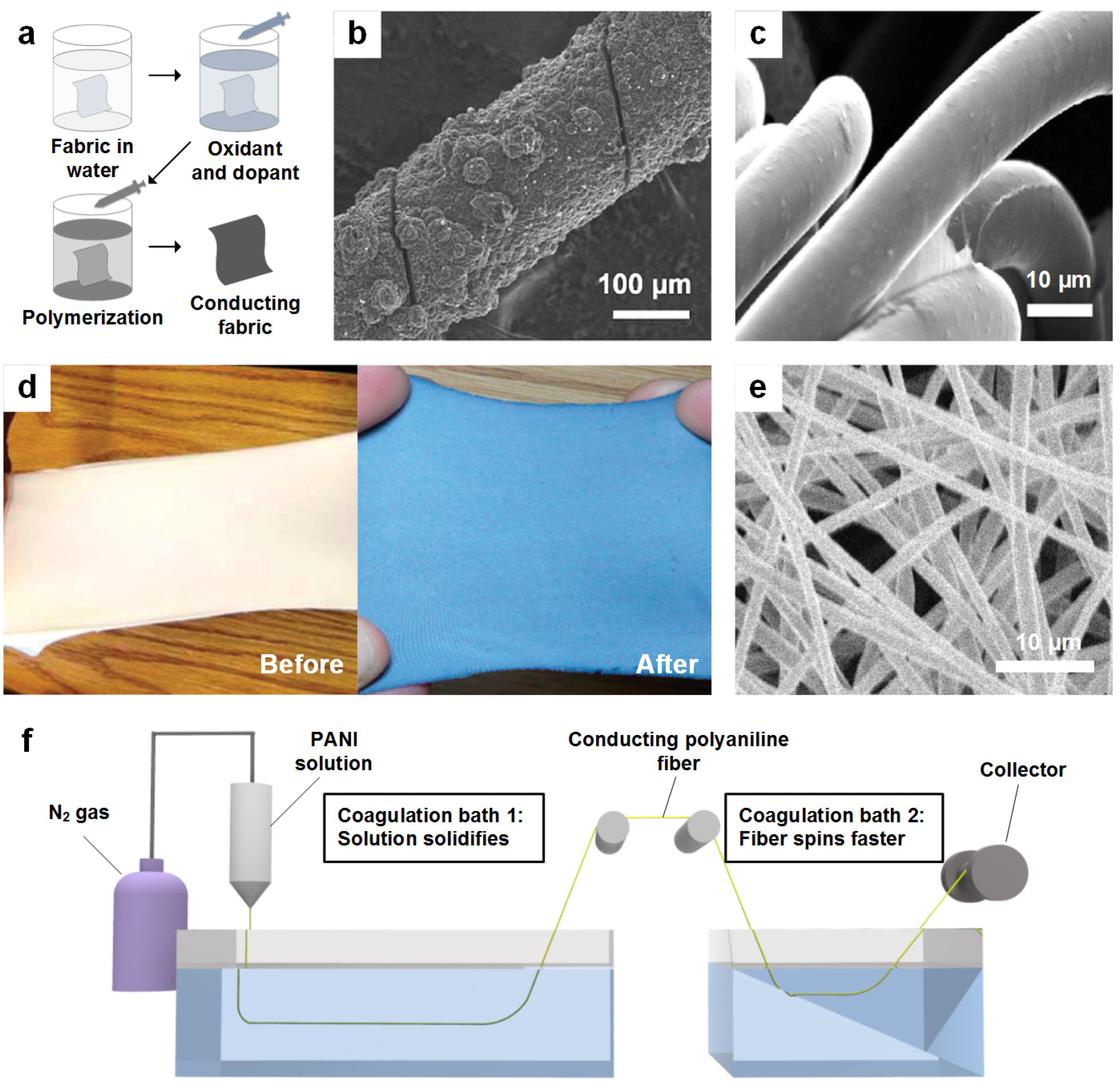 (a) Schematic illustration of the in situ chemical polymerization for conducting polymer-coated fabric; (b) SEM image of a conductive fiber composed of carbon nanotube bundles coated with polypyrrole; (c) SEM micrograph of stretchable spandex fabric after a dip coating process with polystyrene sulfonate-doped poly-(3,4-ethylenedioxythiophene) (PEDOT:PSS); (d) Optical image of stretchable fabric before and after dip coating with PEDOT:PSS; (e) Surface morphology of polyaniline (PANI): polyethylene oxide (PEO) electrospun fiber; (f) Wet fiber spinning technique process. Reproduced from [68,73,74] with the permission by Royal Society of Chemistry, Copyright 2015, and by ACS Publications, Copyright 2010, 2012.