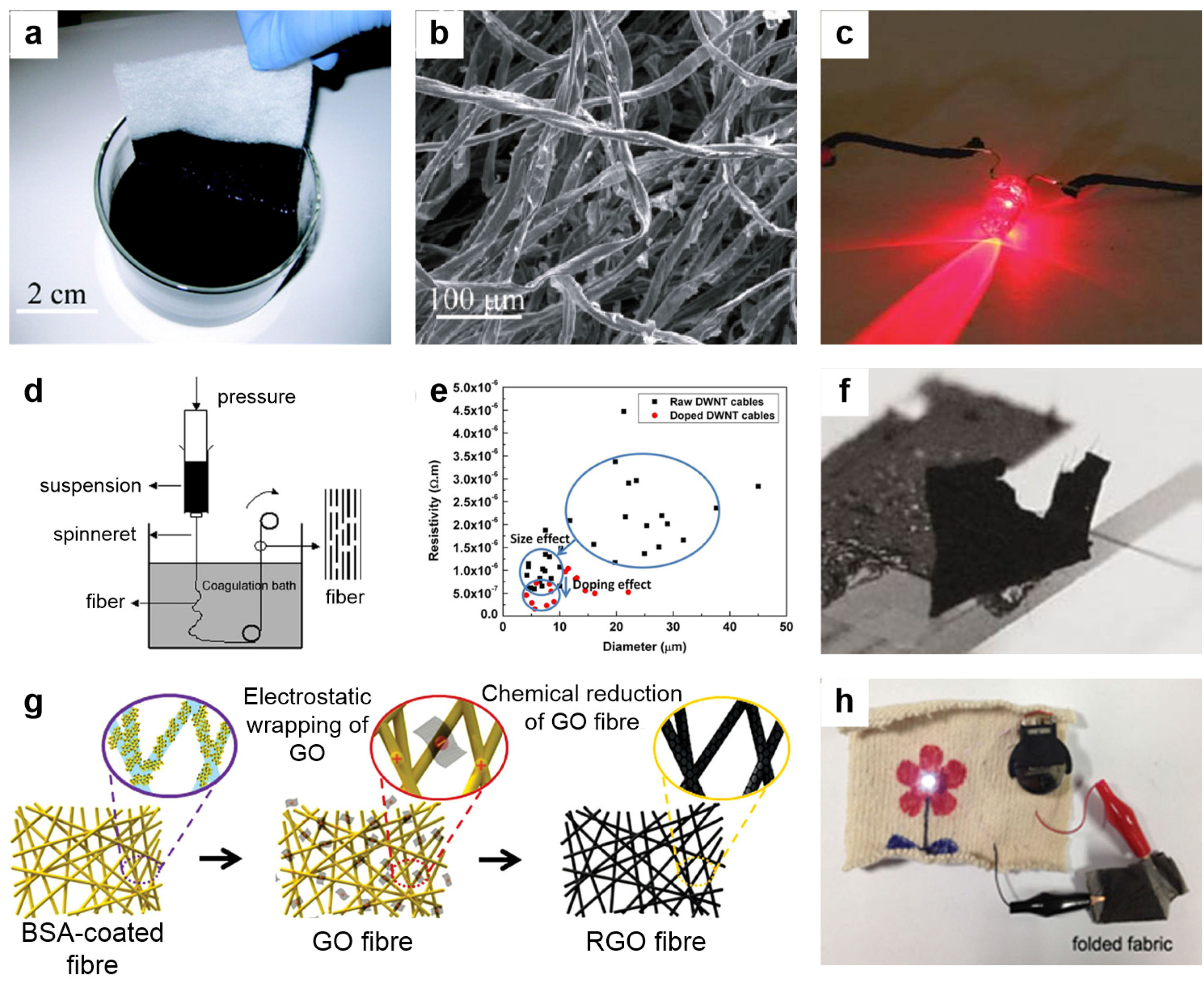 (a) Optical image shows the dip-coating process of fabric into single-walled carbon nanotube (SWCNT)s ink for SWCNT-based conductive fabric; (b) SEM image of a cotton sheet coated with SWNTs on the fibrous surface; (c) Demonstration of LED emission with CNT-based conductive fibers; (d) Schematic of the experimental setup of the wet spinning method for CNT-based conductive fibers; (e) Resistivity versus diameter plot for raw DWNT (double walled CNT) and iodine doped DWNT cables; (f) Image shows a free standing CNT array through which a yarn is pulling out; (g) Schematic illustration of the fabrication process of graphene oxide-based conductive fiber using electrostatic force; (h) Photograph of a LED light using a folded, reduced graphene-oxide-based conductive fabric. Reprinted from [83,87,102,103,104,105] with the permission by ACS Publications, Copyright 2010, 2008 and by John Wiley and Sons, Copyright 2008, 2013 and by Nature Publishing Group, Copyright 2002, 2011.