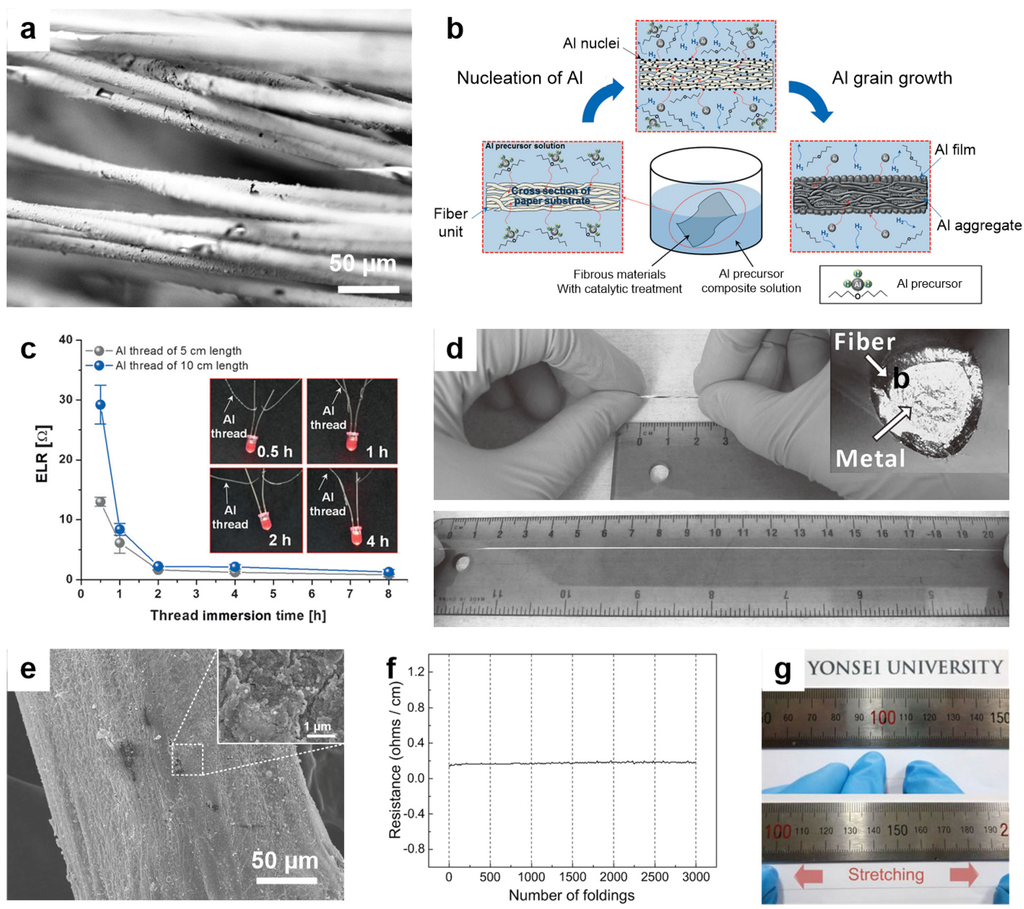 Electroplated or electroless plated metals, liquid metals, and metallic nanomaterials such as nanoparticles or nanowires are considered ideal candidates in the growing field of wearable electronics [109,110]. Metal plating methods have been widely used to deposit metal for printed circuit boards, metallization processes in microfabrication, and corrosion protection. Figure 4a shows an SEM image of a gold-plated conductive fiber, in which Kevlar fibers were first treated with Sn2+ and Pd2+ ions followed by electroless Ni deposition for conductivity [109]. Au was then electroplated onto the surface to achieve a conductive fiber with a conductivity of ~6 S/cm and power output of 1 W. However, the metal films are weakly attached to the surface and may separate from the fiber during further processing. To overcome these obstacles, a recent study presents a new, simple, and inexpensive chemical solution method, as shown in Figure 4b [88]. In this process, an Al precursor was used to deposit Al on the surface of fibrous materials. Figure 4c shows the electrical resistances verses immersion time in the Al precursor solution, and the inset shows an LED connected to these fibers [88].