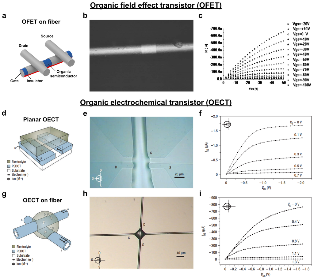 (a) Schematic picture of the organic field effect transistor (O-FET); (b) Optical image showing channel area; (c) The output characteristic of O-FET; (d) Schematic picture of a planar OECT; (e) Optical micrograph of a planar organic electrochemical transistor (OECT); (f) Output characteristic of a planar OECT; (g) Schematic picture of a fiber OECT; (h) Optical micrograph of a fiber OECT; (i) Output characteristic of a fiber OECT. Reprinted from [122,123] with permissions by AIP Publishing LLC, Copyright 2006 and by Nature Publishing Group, Copyright 2007.