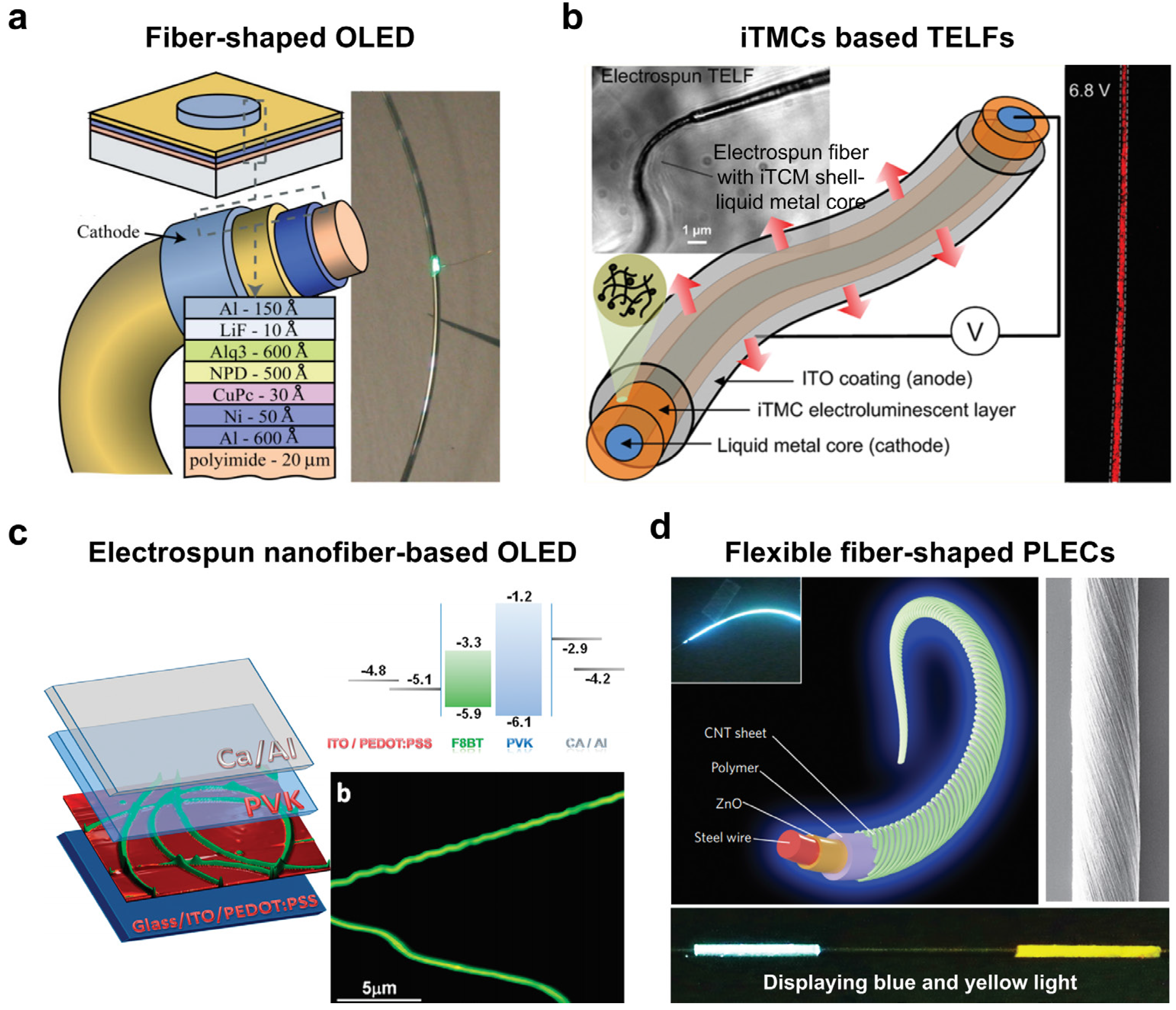 Connor et al. fabricated a fiber-based OLED using molecular organic compound as an active layer [134]. The inherently-flexible nature of molecular organic compounds is compatible with fiber structure. Figure 6a shows a schematic illustration of the fiber-based OLED structure used in this study [134]. Here, a polyimide-coated silica fiber was prepared as a substrate, and emission layers and organic charge transport layers were deposited between the anode and cathode electrodes via a vacuum thermal evaporation technique. A photograph of a 1 mm segment of green-light OLED on fiber clearly shows the emitting characteristics of green light. For a performance comparison of electricity and luminescence between a fiber-based OLED and planar OLED, they fabricated a planar OLED using a planar silicon/polyimide substrate and investigated the electrical and luminescence characteristics. The electrical and luminescence characteristics of fiber-based OLEDs showed comparable results to planar OLEDs; however, a slightly larger leakage current was measured at low bias due to the surface roughness of the fiber structure. In addition, the fiber is rather thick at ~480 μm, which can hinder practical use. Yang et al. recently fabricated single core-shell fiber OLEDs based on an ionic transition-metal complex (iTMC) using a coaxial electrospinning process [135]. A galinstan liquid metal core and a ruthenium tris (bipyridine) with poly (ethyl-oxide) (PEO) mixture shell were co-electrospun to from the cathode and electroluminescent layer, respectively. The anode was formed via thermal evaporation of indium tin oxide. Figure 6b shows a schematic illustration and optical image of an emitting iTMC [135]. The device was initially turned on at 4.2 V and bright electroluminescent was observed at 6.8 V. This work shows the possibility of direct fabrication of 1D flexible OLEDs without flexible substrates; however, the efficiency or brightness of the devices is not clearly shown.