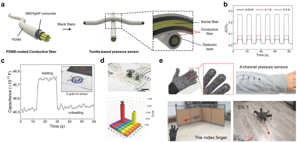 Recently, Lee et al. fabricated a textile-based pressure sensor using Ag-SBS composite conductive fibers [20]. A capacitive type of textile-based sensor was fabricated using a poly(dimethyl-siloxane) (PDMS) coating on the conductive fiber and cross-stacking two PDMS-coated fibers, as shown in Figure 7a [20]. Figure 7b shows the relative changes in capacitance of fiber-based pressure sensors via increasing loads of applied pressure [20]. In this operation, the conductive fiber-based pressure sensor showed stable responses to the various loads (Figure 7c), and detected the loading and unloading of grains of extremely low weight. This work further demonstrates e-textile applications with conductive fiber-based pressure sensors. The textile-based pressure sensor was pixelated through weaving techniques and detected the spatial distribution of external pressures, as shown in Figure 7d [20]. This textile-based pressure sensor was also sewn into a smart glove and clothes and showed the control of drone and spider robots, as shown in Figure 7e [20]. This work demonstrates that human-machine interfaces can be successfully operated using wearable textile-based pressure sensors with ultrahigh sensitivity and stability.