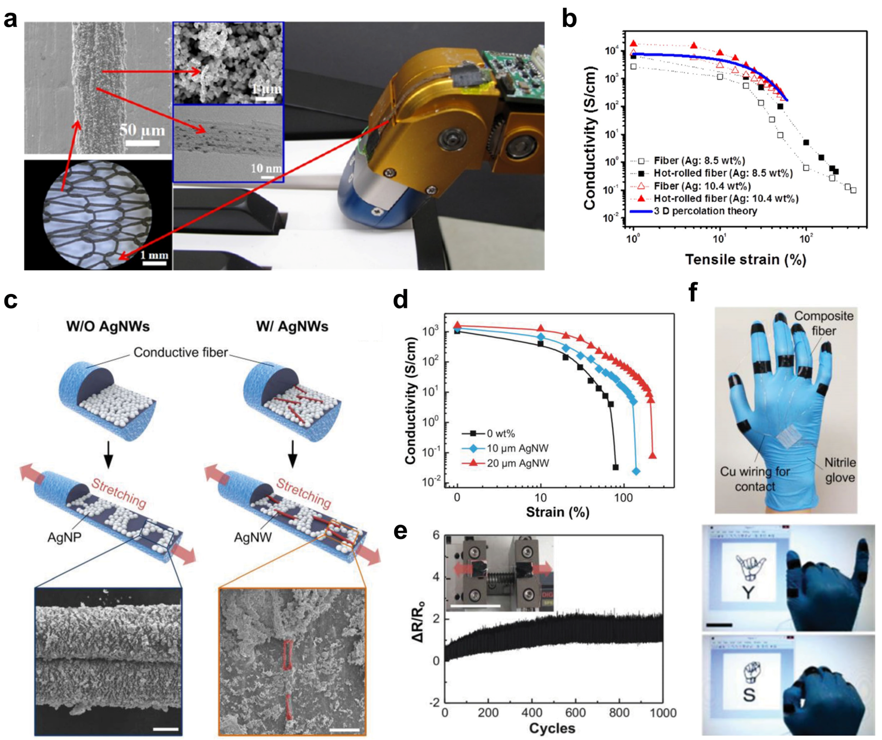 (a) FE-SEM and HRTEM images of knitted fabrics made from highly-conductive stretchable fibers. Bottom of this image shows an optical image of 2 ply rope. The knitted fabric was attached to a robot finger (as shown by arrow) for touch sensing; (b) Plot shows the conductivities of fibers as a function of tensile strain; (c) Schematic illustration of silver nanowires (AgNWs) and silver nanoparticles (AgNPs) in the composite fiber. (Left bottom image in navy colour line: SEM image of AgNP-mixed styrene-block-butadienstyrene (SBS) fiber without AgNWs at 50% strain and and Right bottom image in red colour line: SEM images of the AgNW-AgNP embedded SBS fiber at 50% strain); (d) Changes in conductivity of the composite fiber depending on the length of the AgNWs; (e) Reliability test measured the changes in the normalized resistance of the composite fiber; (f) Photograph of a smart glove made with composite fibers and motion detection of English letters using a sign language. Reproduced from [90,154] with permissions by ACS Publications, Copyright 2014 and by John Wiley & Sons, Copyright 2015.